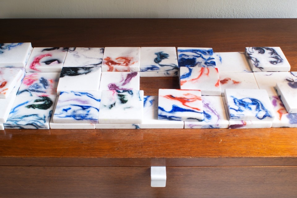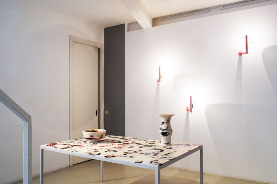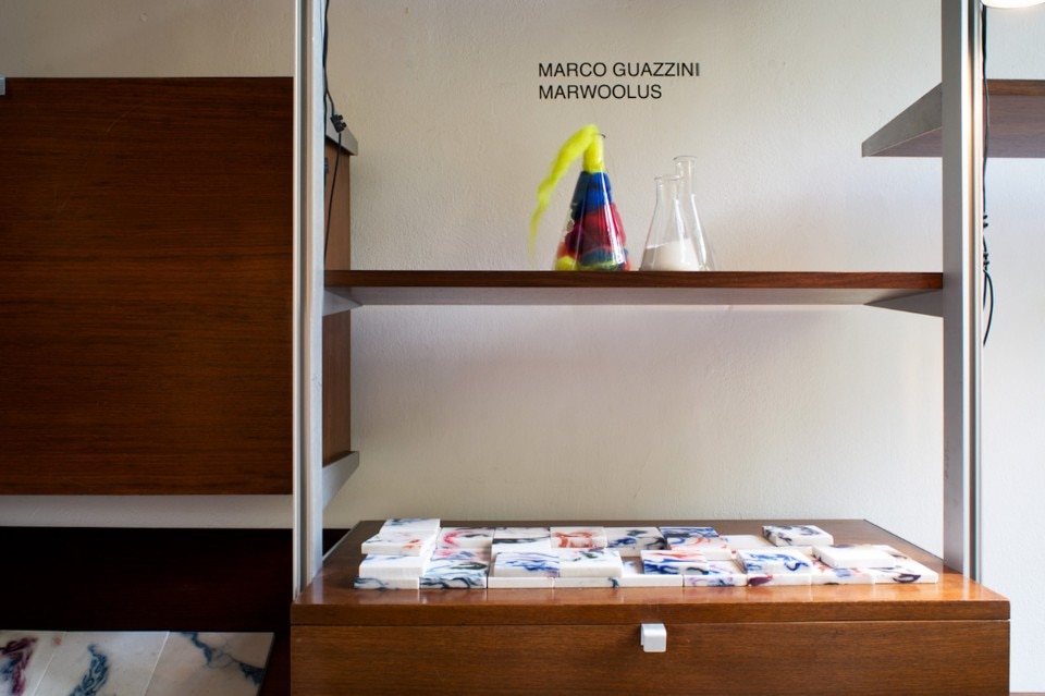 Marco Guazzini presents the results of his research on a new water-repellent material he has called Marwoolus. As the name suggests, it is a combination of marble dust and wool that at first glance might look like a typically veined marble. But it is warm to the touch, and the marbling is constituted by filaments of wool randomly running through the material, giving it a fluid pattern and making it dynamic and gentle on the eye. The tour of the Galleria ends on the second floor, where Andrea Anastasio is showing his Ri-frazioni project made up of objects, seats and vases distinguished by heterogeneous materials – shards of broken mirror; pieces of glass that are “sewn” and “woven” by ripped swathes of floral fabric; upholstered chairs; and “sewn” marble tables.