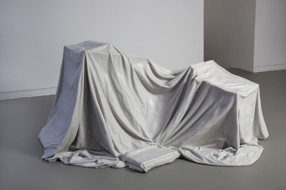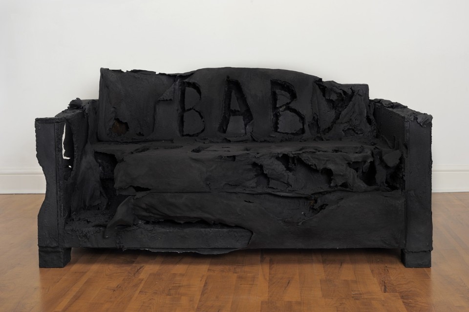 Kaari Upson, Baby Please, 2012. Loveseat, charcoal, aqua-resin, fiberglass; 28 1/2 x 59 x 32 inches (72.4 x 149.9 x 81.3 cm). Courtesy the artist and Massimo De Carlo, Milan/London