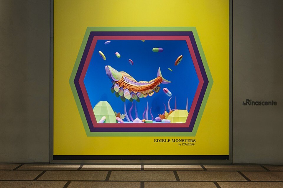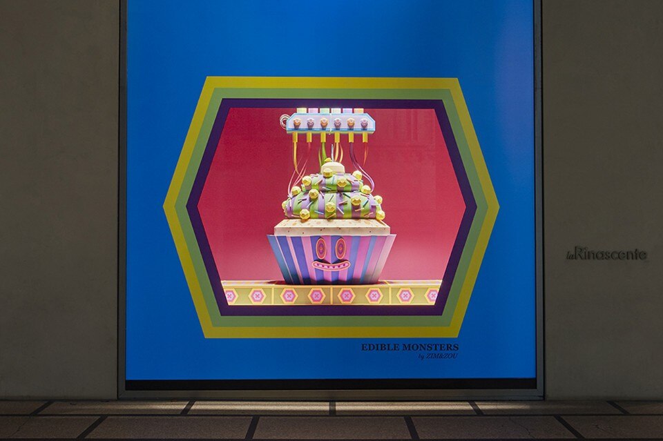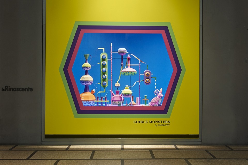 Zim&Zou, Edible Monsters. But what do we eat? A 3D printer prints a cupcake using ink that is labelled edible. The cake slowly takes shapes and gives life to a strange character; thus raising the issue of its edibility. This window is clearly an invitation