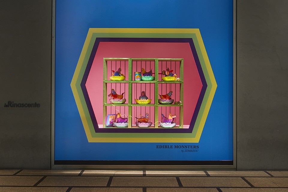 The authors Zim&Zou, the creative French duo composed of Lucie Thomas and Thibault Zimmermann, illustrate in each of the 6 windows a precise modus operandi of the modern food industry creating a colourful paper universe, entirely made by hand. Two windows show the making of the two artists working on their installation.