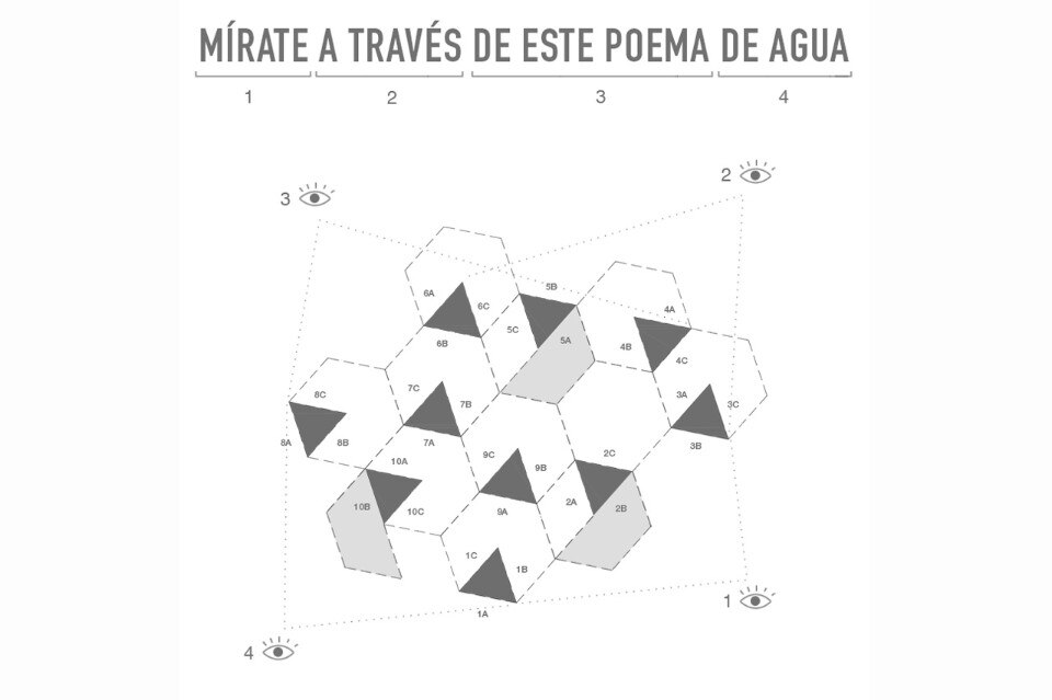 Starting with the verse of the Poem 6 by Enrique Cabezón, poet from La Rioja in Spain (Logroño, 1976) which says: “look at yourself through this poem of water.” Decomposed in four parts, one can read only from certain points when walking the installation perimetrically.