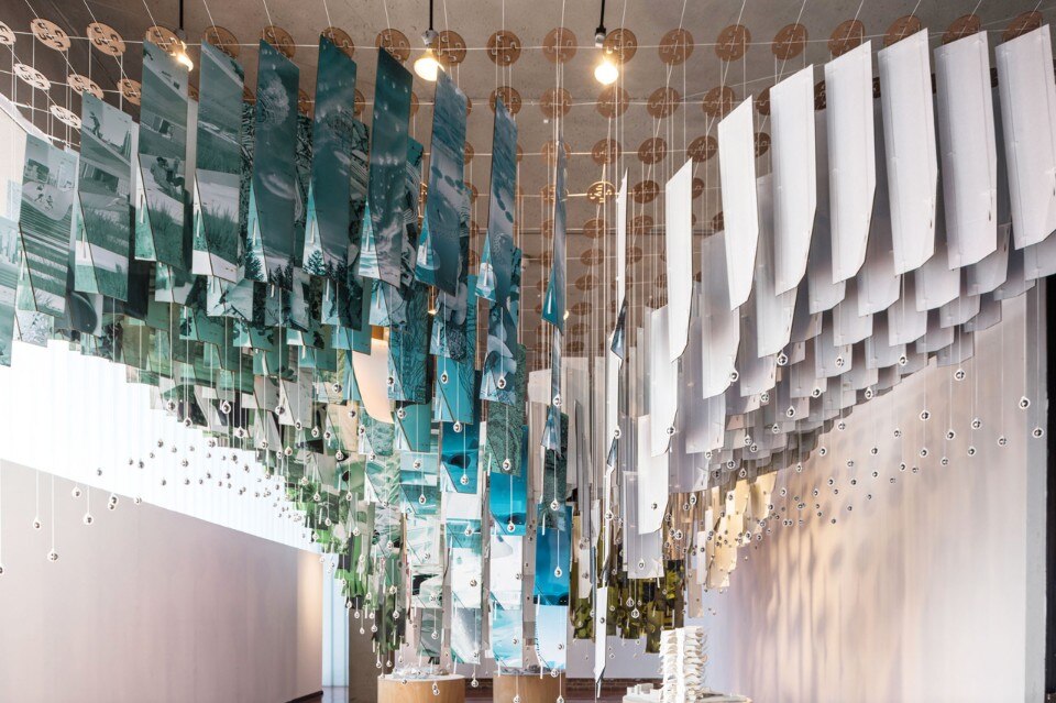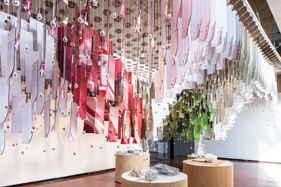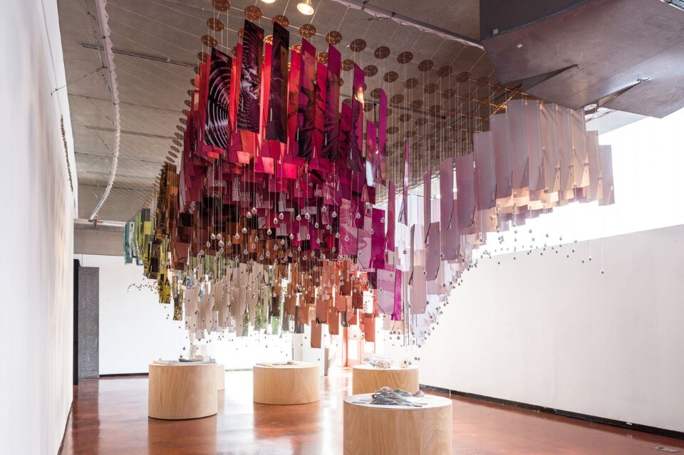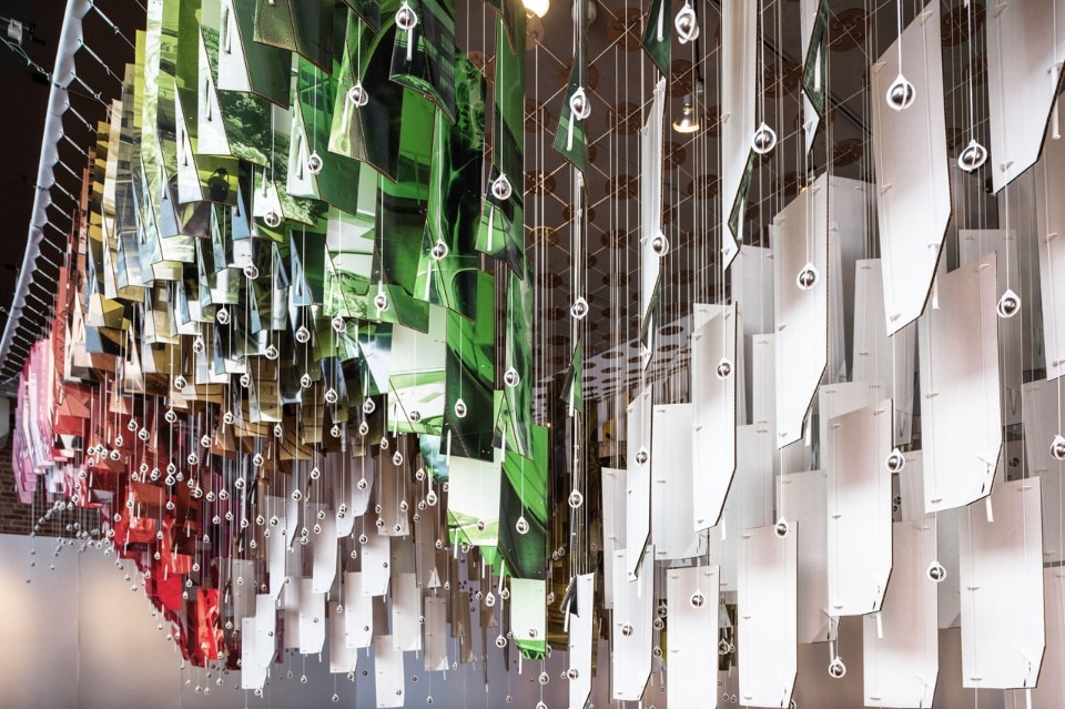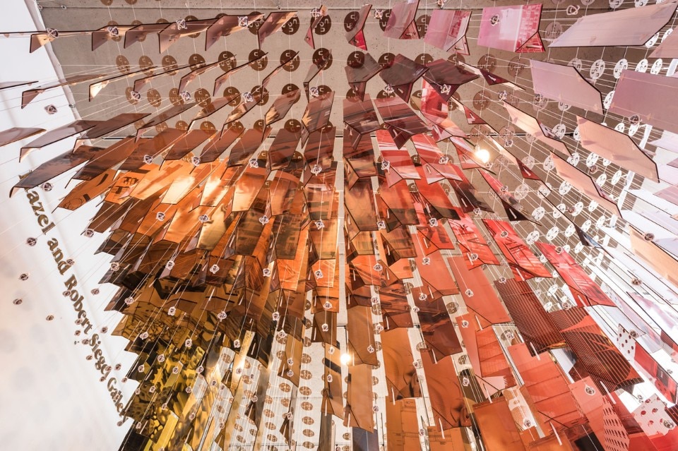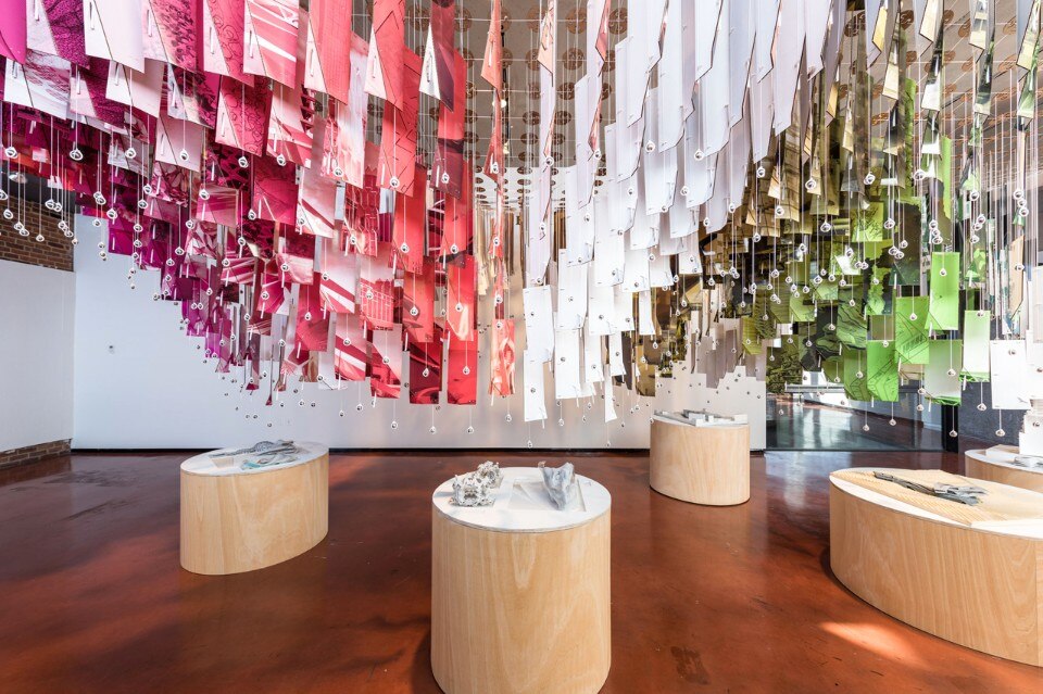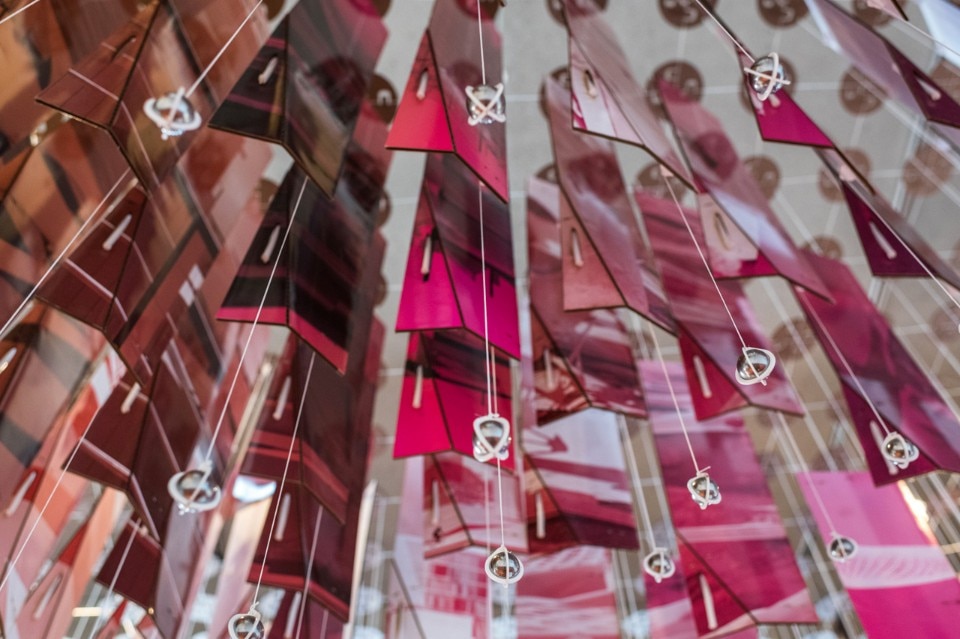 From underneath the gradual rotation of the panels towards the apex of each vault can be seen. This pattern helps produce a visually dynamic filter of the work that comes alive as you move around it, but also frames the work in two ways: the healthy turbulence that exists in the school and the work, that is the common influence and thread that connects everything in the curriculum; the anchors of the curriculum, studio and methodology, act as magnetic fields orienting the work in different ways, providing an extreme variety of direction.