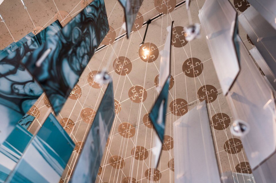 The hanging installation was made of over 800 panels. These were each custom laser cut, assembled, and clad with custom cut images. All of the various details used to create the large volume were made out of flat parts which were laser cut or produced on a CNC mill.