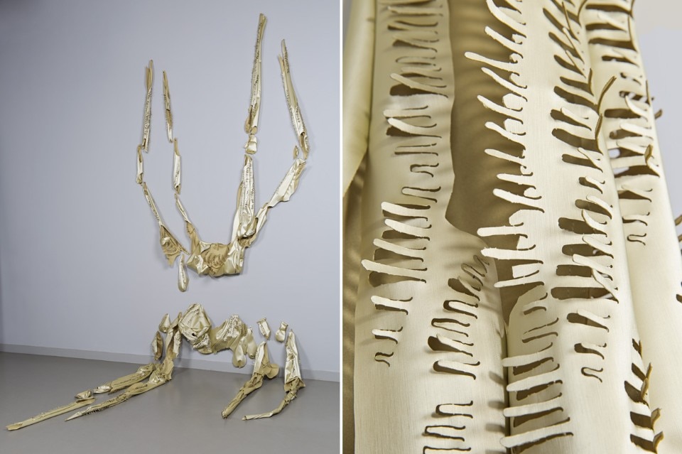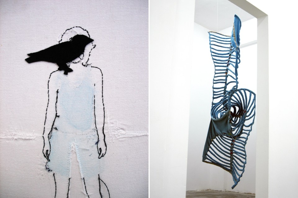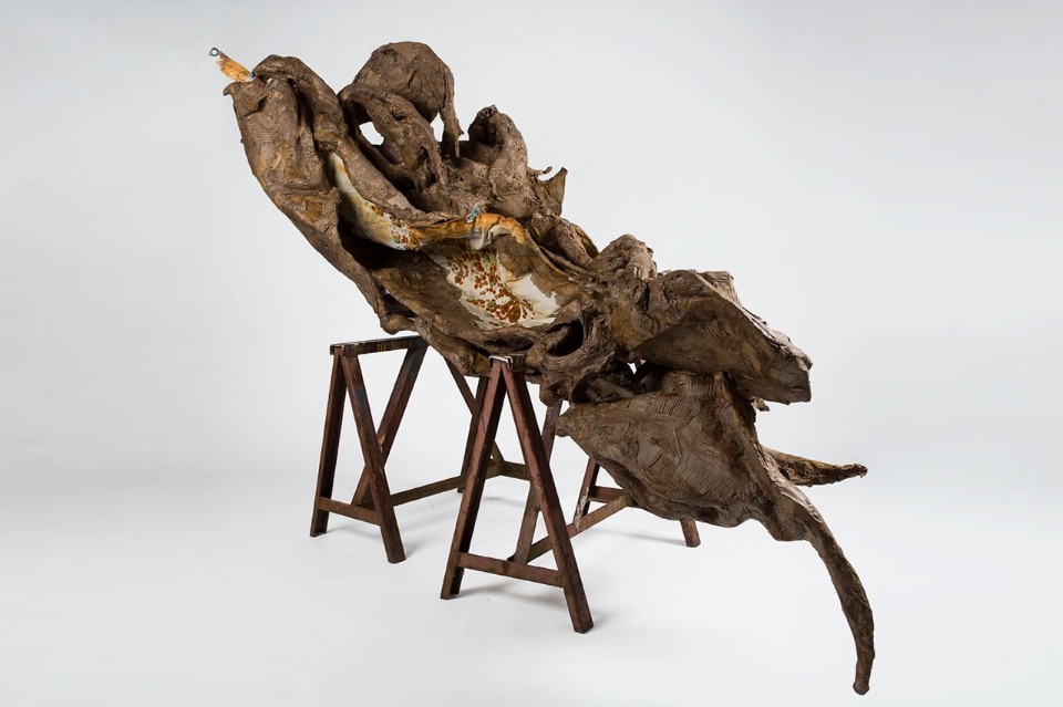 So intimately entwined with humanity, this medium lends itself to addressing life’s great issues. From threatening balaclavas and sweet flowery dresses to “harnesses” of discarded carpets, or antlers bound in cloth: the pieces in “Under the Skin” explore feelings of attraction and repulsion.