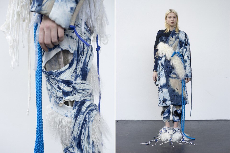 By limiting the cutting-patterns, Elina Määttänen was able to focus more on materials, creating a soft and hugging feel with techniques and textures, such as hand weaving, hand pleating, padding and shibori-dye. The work of the young designer – a 2014 graduate from Aalto University School of Art, Design and Architecture – expresses her interest in workwear, military and winter coats, clothes that bring security.