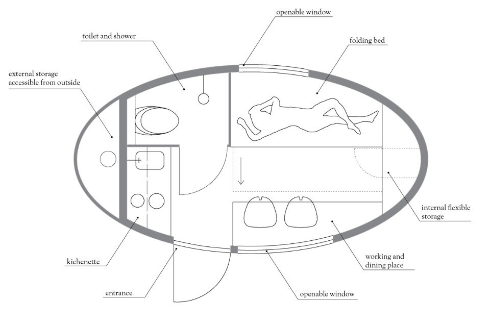 The body of an Ecocapsule is covered with 2.6 sqm of high-efficiency solar cells and a retractable pole holding a 750 W wind turbine is further attached to the body. This creates an energy system that can support you almost an entire year in many off-grid locations.