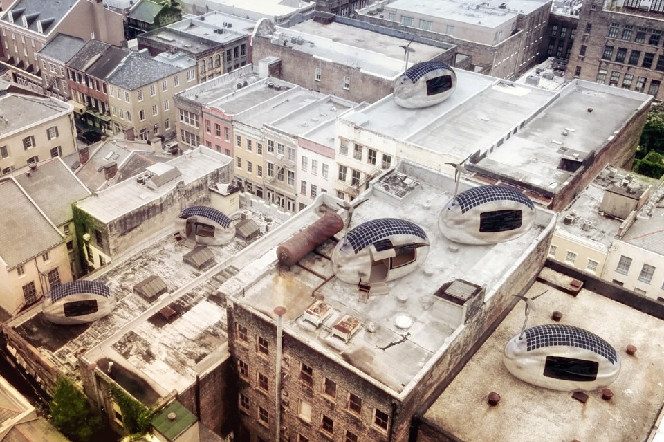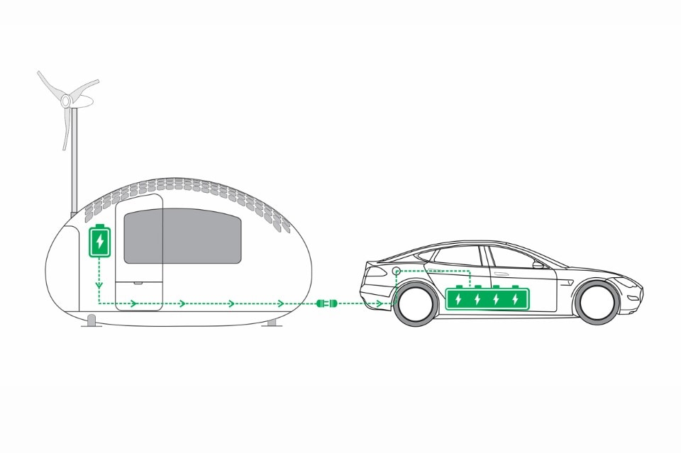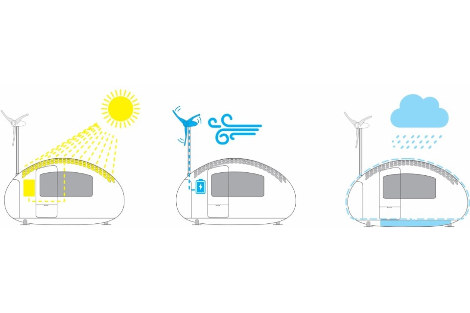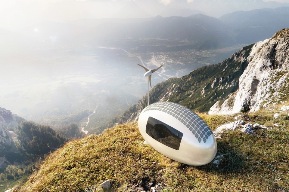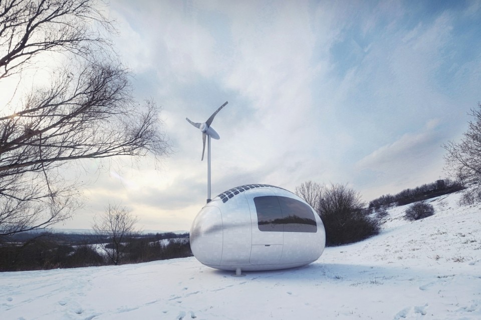 Ecocapsule is powered by a built-in wind turbine complemented with an array of solar cells. Dual power system and a high-capacity battery ensures that you will have enough power during periods of reduced solar or wind activity.