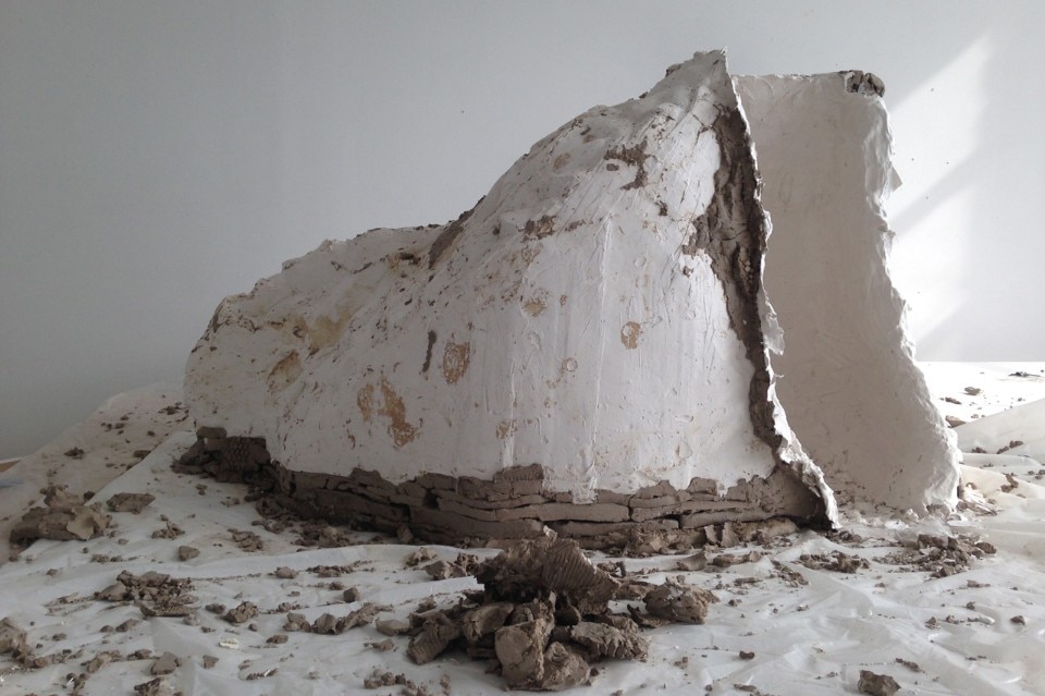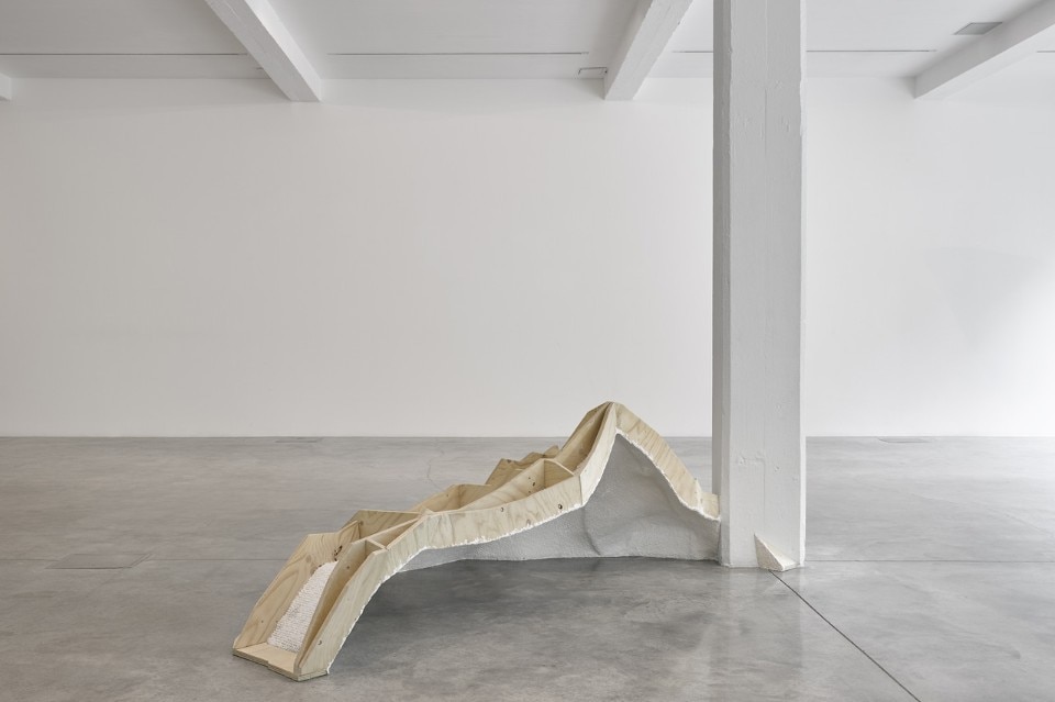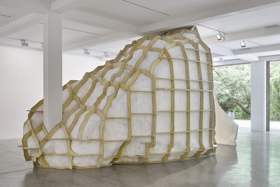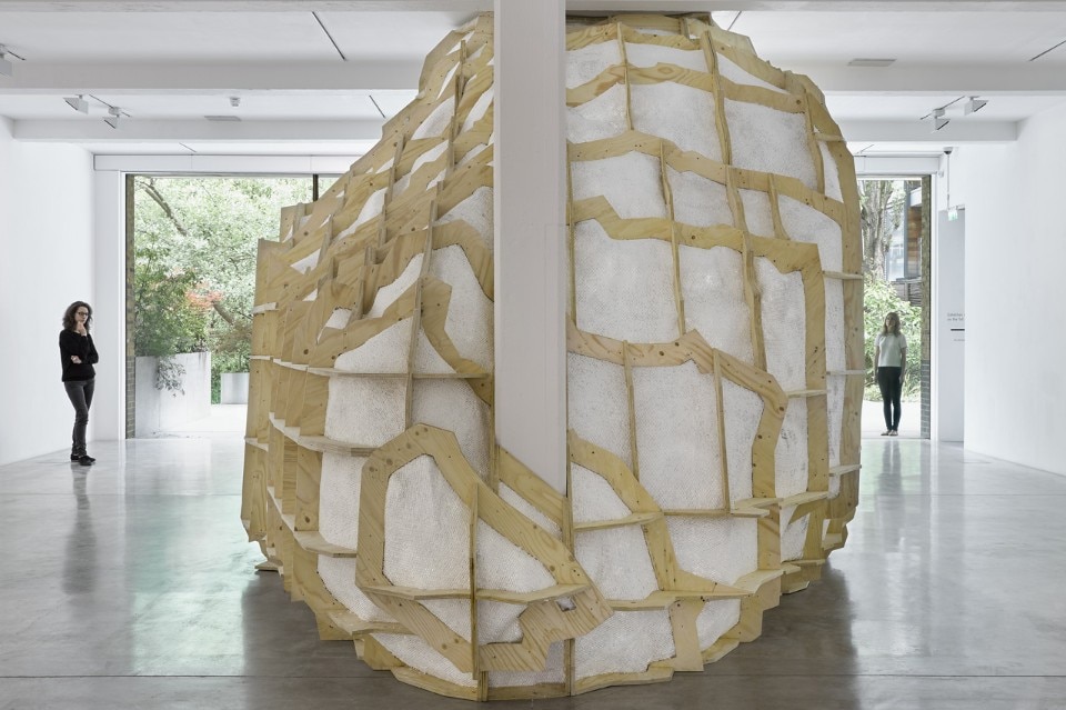 From the Latin term for “going above ground”, Supra Terram resembles a natural subterranean cave and a man-made grotto. This site-specific work is the artist’s response to the two floors of exhibition space at Parasol unit, where visitors must move between the lower and upper galleries to fully discover and mentally unify the two parts of the sculpture. A sequence of experiences unravel as visitors encounter a disorientating shift in scale, from being somewhat overwhelmed by the cavernous structure in the lower gallery to being in a position to look down at the tip of it emerging through the floor of the upper gallery.