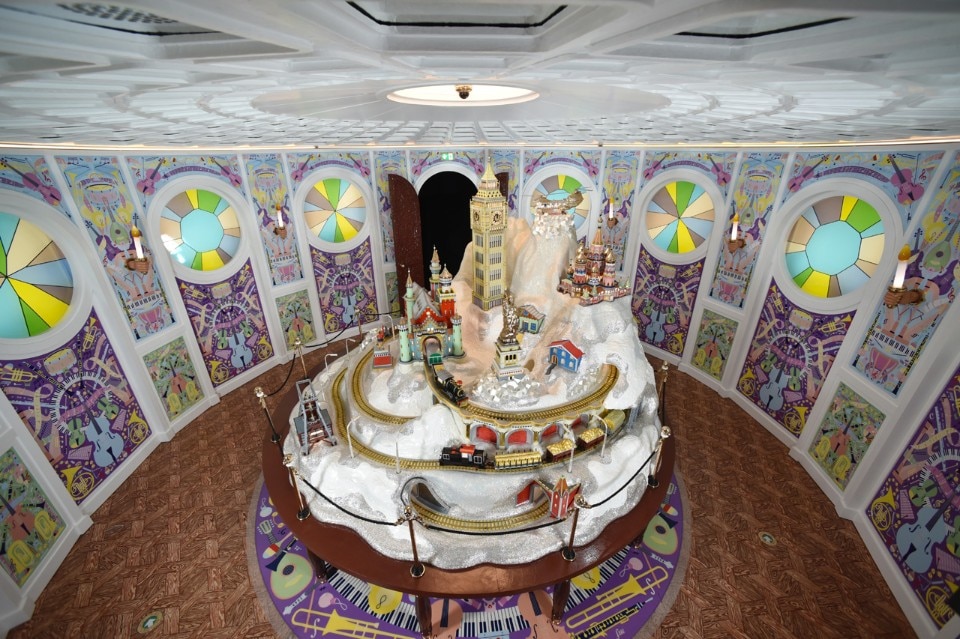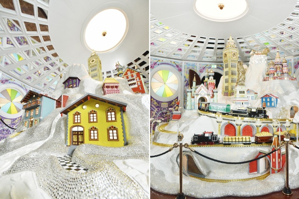 Entering through a double door, you come into an expansive circular space 9 meters across. We immediately see that the entire space is part of a total installation. Monumental paneling surround the room and large, round stained glass windows are illuminated with daylight shining behind them, so it looks like the windows open onto an outdoor area. In a kaleidoscopic fashion, the stained glass portrays the views of a greatly enlarged diamond.