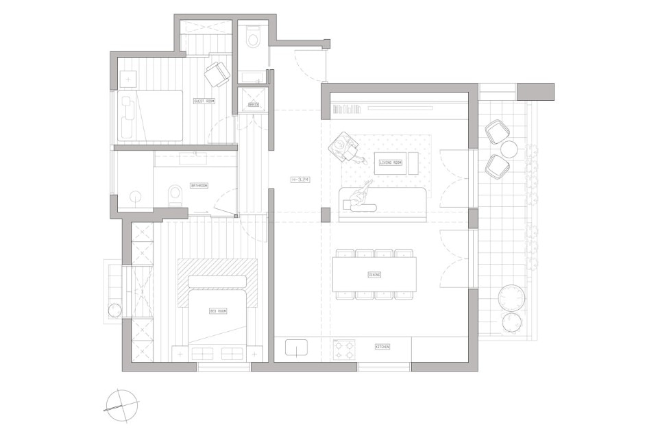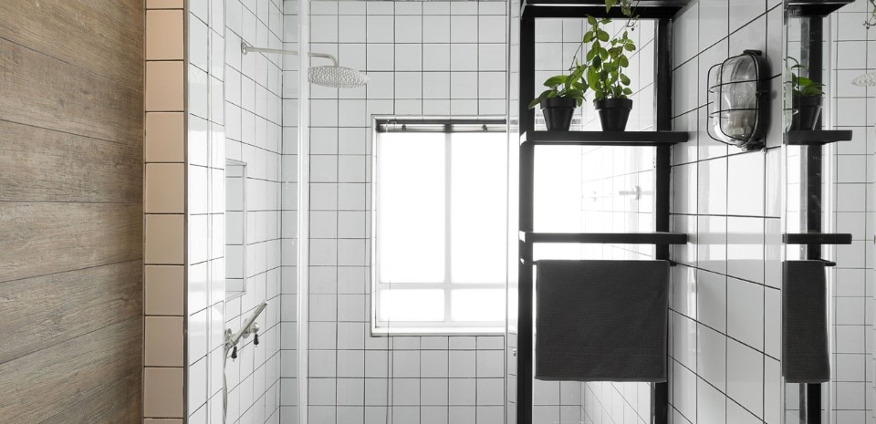 The dividing wall was left exposed and painted with a gentle gloss, resting on a concrete slab floor on one side and on an oak wood on on the other. The floor defines the functions of the home, between public and private. The sound system and AC are placed throughout the house and hidden behind wooden doors in the lounge. The bathroom is wholly made from thin metal profiles connected to each other and meshed glass almost like a patio in the center of the apartment which becomes the entrance for natural light source.