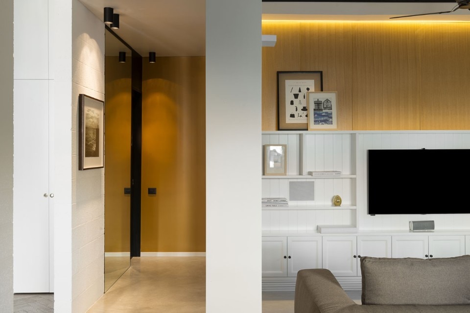 With a simple brick wall that divides the space into three parts Raanan Stern adapted a 1930’s apartment into a place that responds to modern needs.