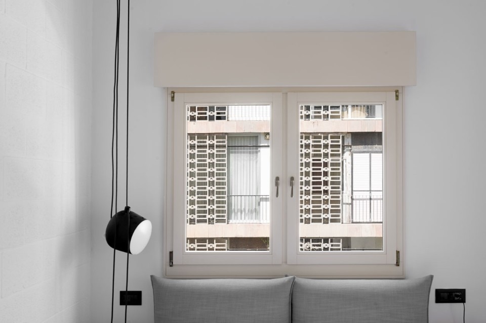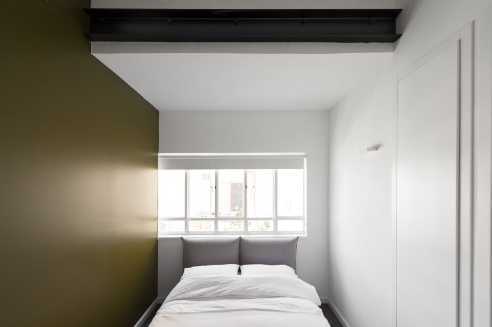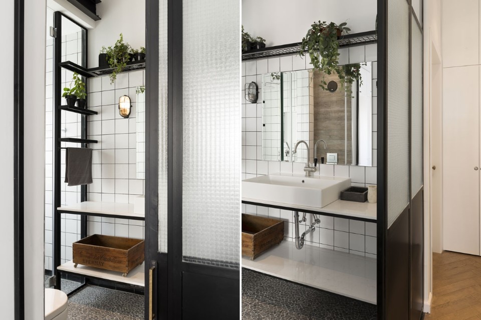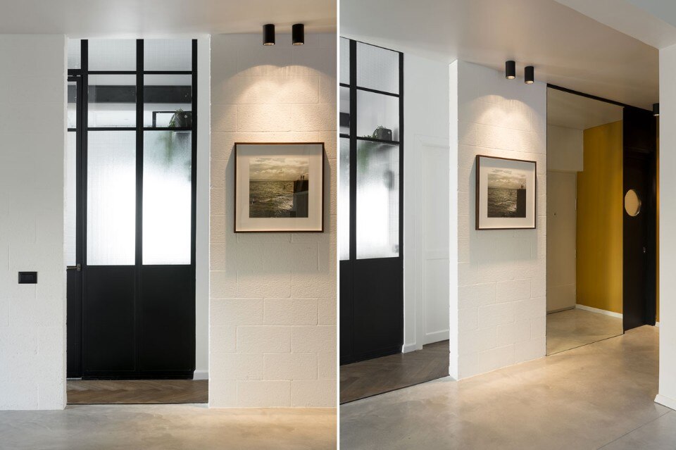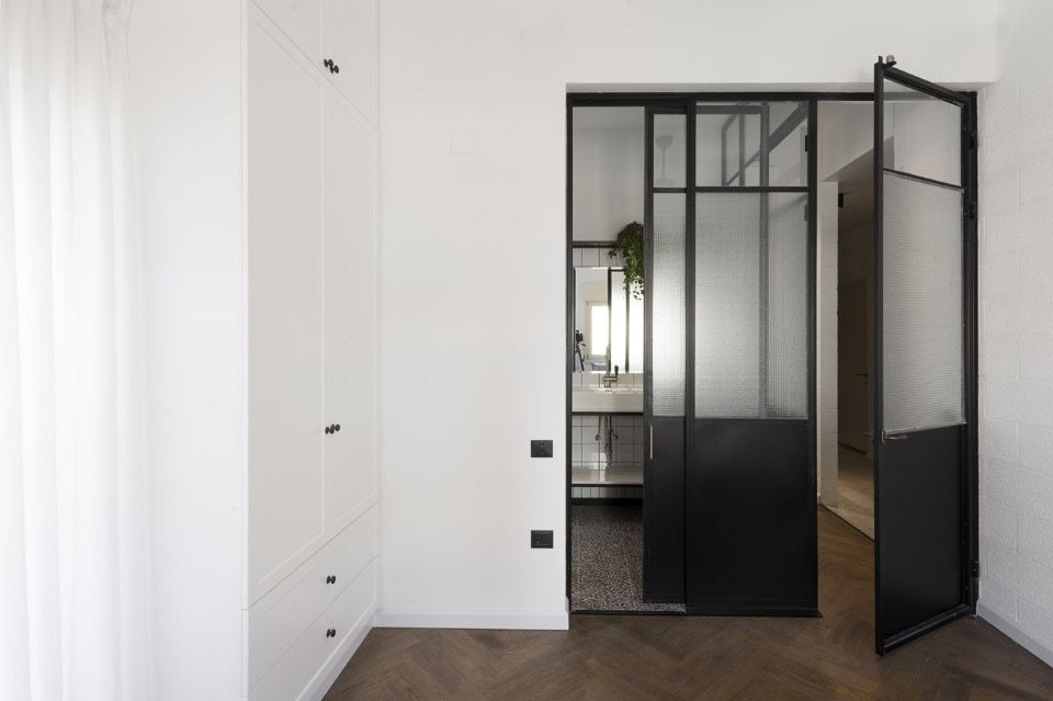The central concrete beam was exposed and divides the public space between the lounge and kitchen. The metal beam in the guest room was exposed and painted black. The windows and doors of the apartment are an identical copy of those that were in the apartment 80 years ago when it was built, in color and style.