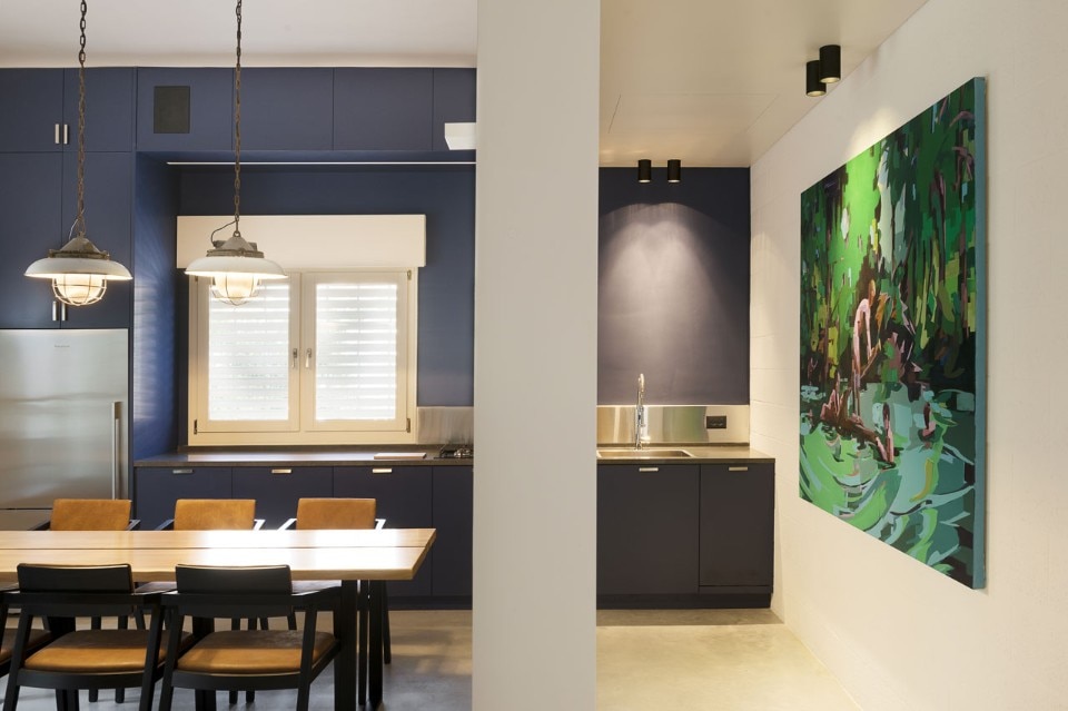 The light sources in the home are a mixture of modern and older fixtures such as the two hanging lights above the dining area which were dismantled from an old factory in the Czech Republic. Every piece of carpentry was planned by the architects and customized to the needs of the owner. Opposite the lounge is the dark blue wall which conceals the kitchen which is painted in the same color.