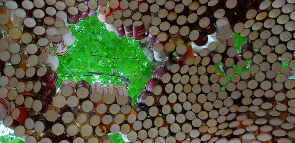 The paper cup pavilion was constructed from waste tea and coffee cups collected from university canteens and a shopping mall for a period of three months. About 15,775 cups, collected as bricks for the pavilion, were washed and dried. The cups were held together with a total of 4 kg. staple and sewn with string for structural durability.