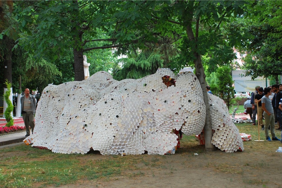 The pavilion was constructed by architecture students in the faculty building and moved to the exhibition area. The shape of the pavilion was designed, however due to on-site weather conditions, it was hung between the trees and supported with columns. Each column consisted of approximately 300-400 cups. It stayed on the site for only four hours to get public attention and arise public discussion.
