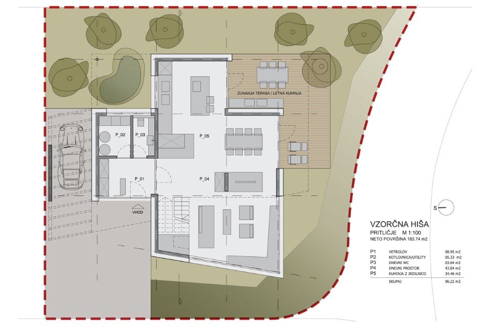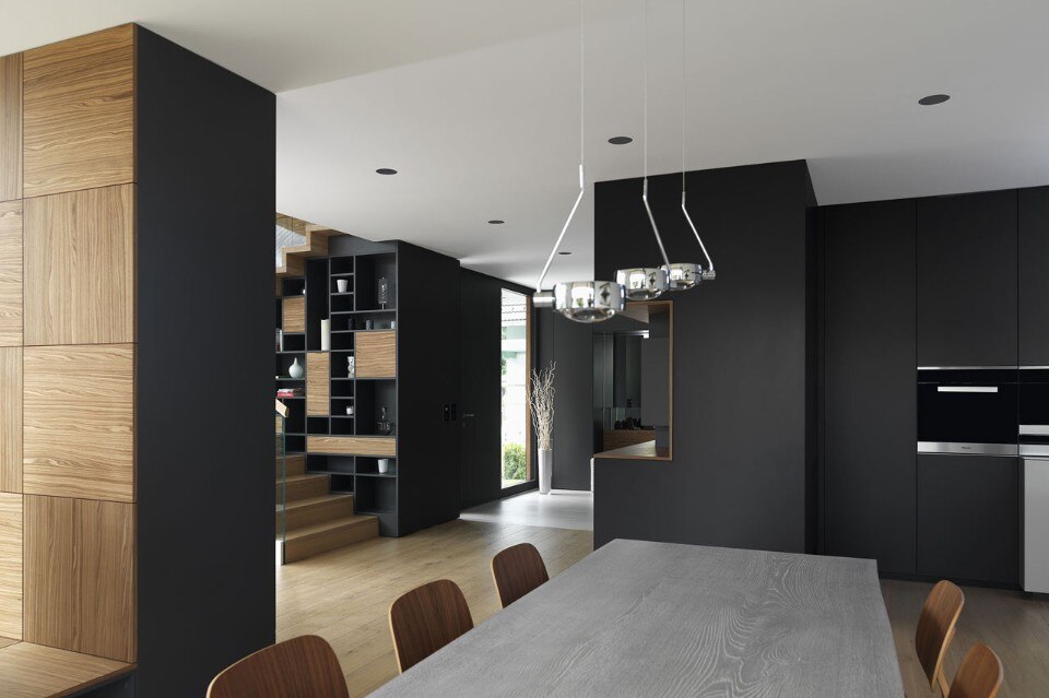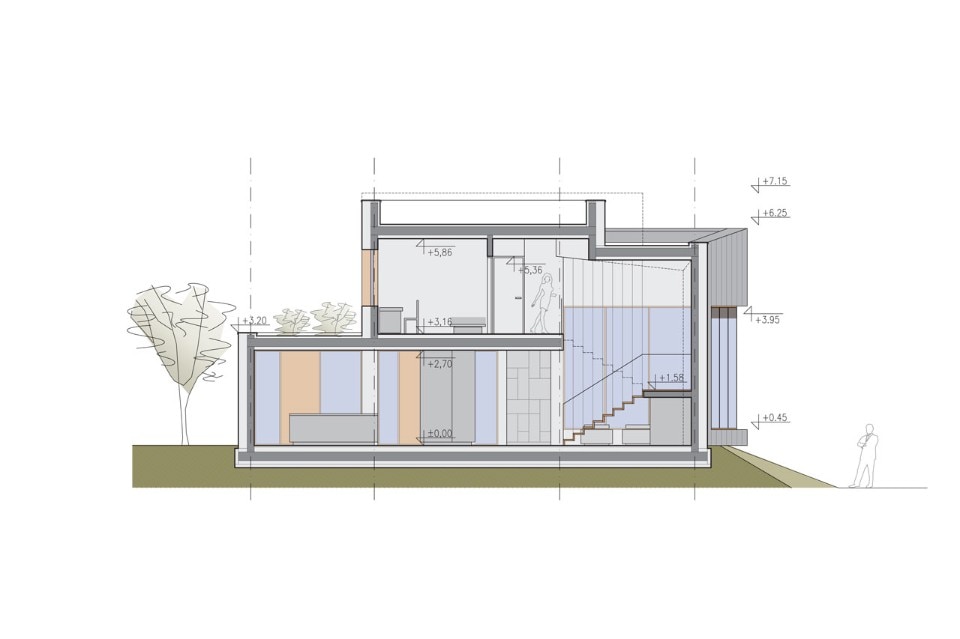 The unified facade constructed of large format panels emphasizes the dynamics of the house’s form. Nevertheless, the type of materials that are used are subdued. Dominant material is wood in its natural colors that are combined with light shades of the facade’s surfaces. Larger glazed surfaces present the connection to its natural surroundings. The result is a modern residential building with optimal functional floor plans, which offer a comfortable and a pleasant living.