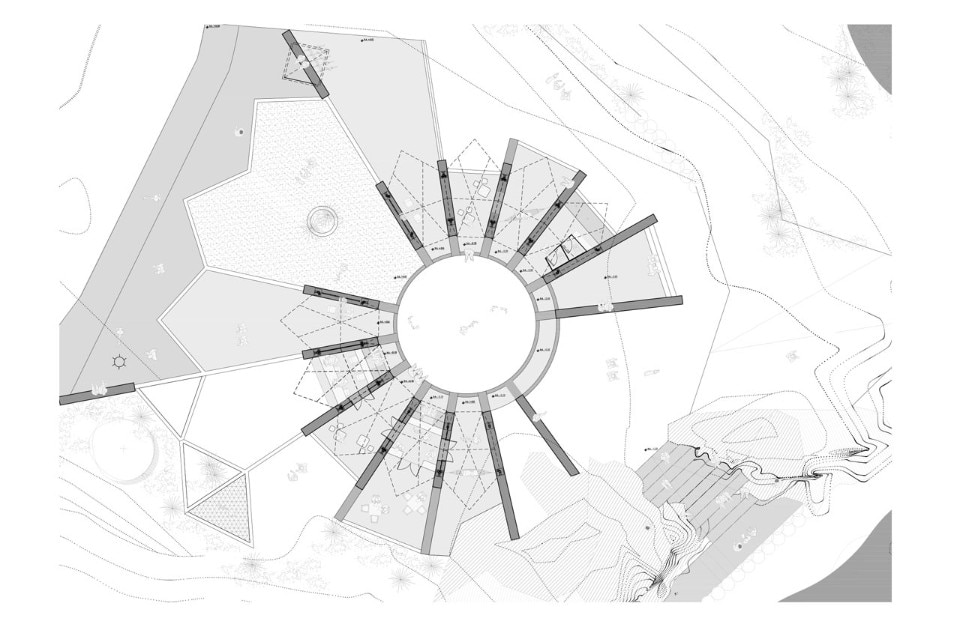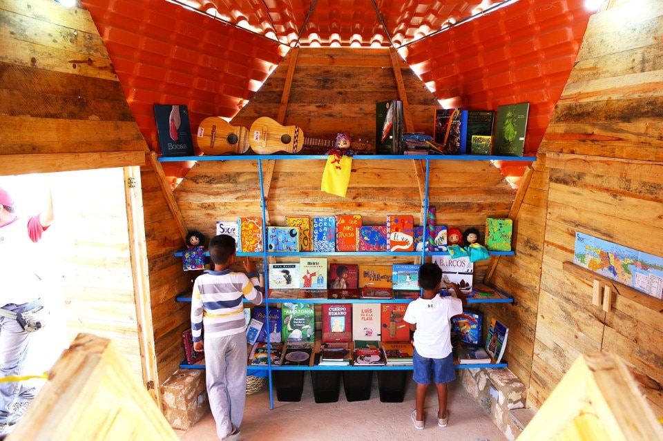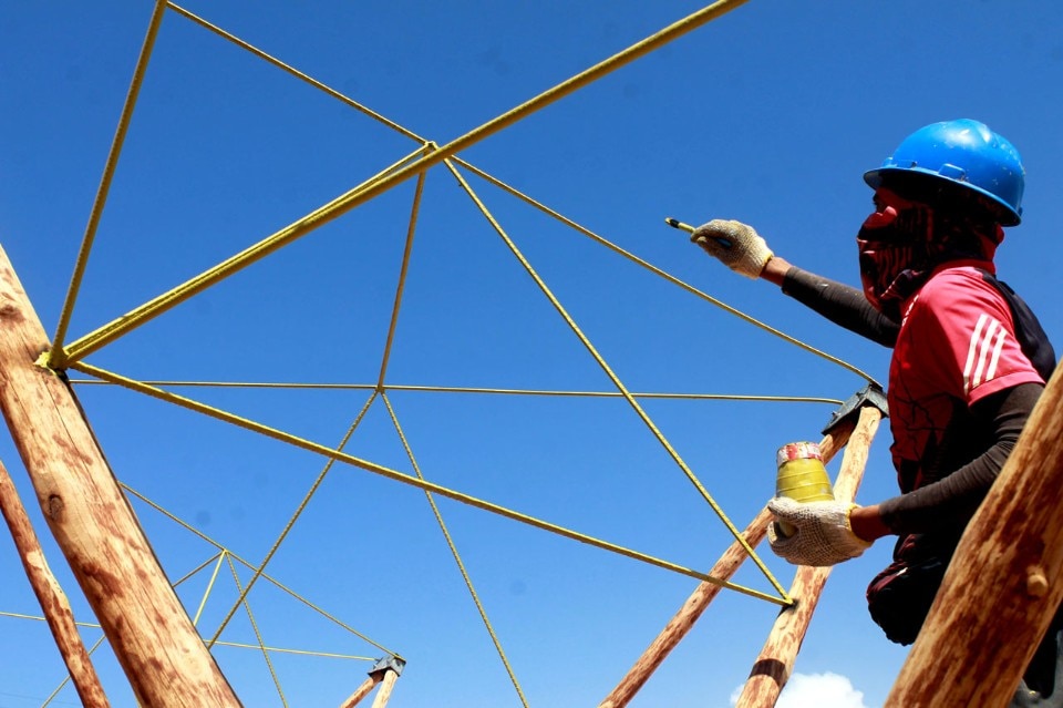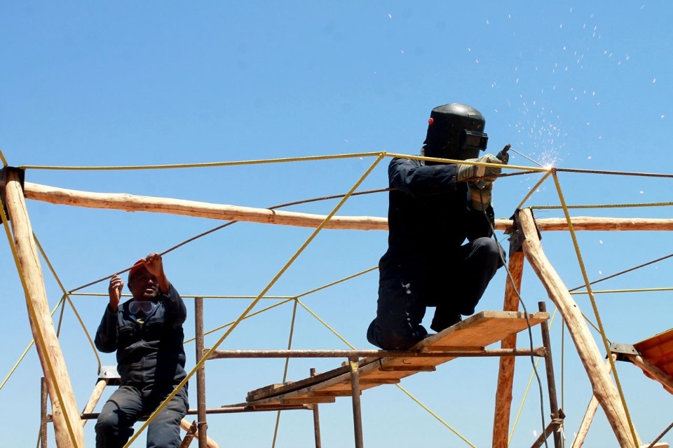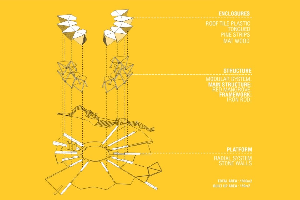 The building is cemented upon a basement made of local-stone walls, that serve to modulate and articulate the space, and uses metallic nodes to connect the bearing structure, solved by triangulation of wood and steel rods. Wood and plastic enclosures are added to the structure to allow the weather control while propitiating open and continuous spaces.