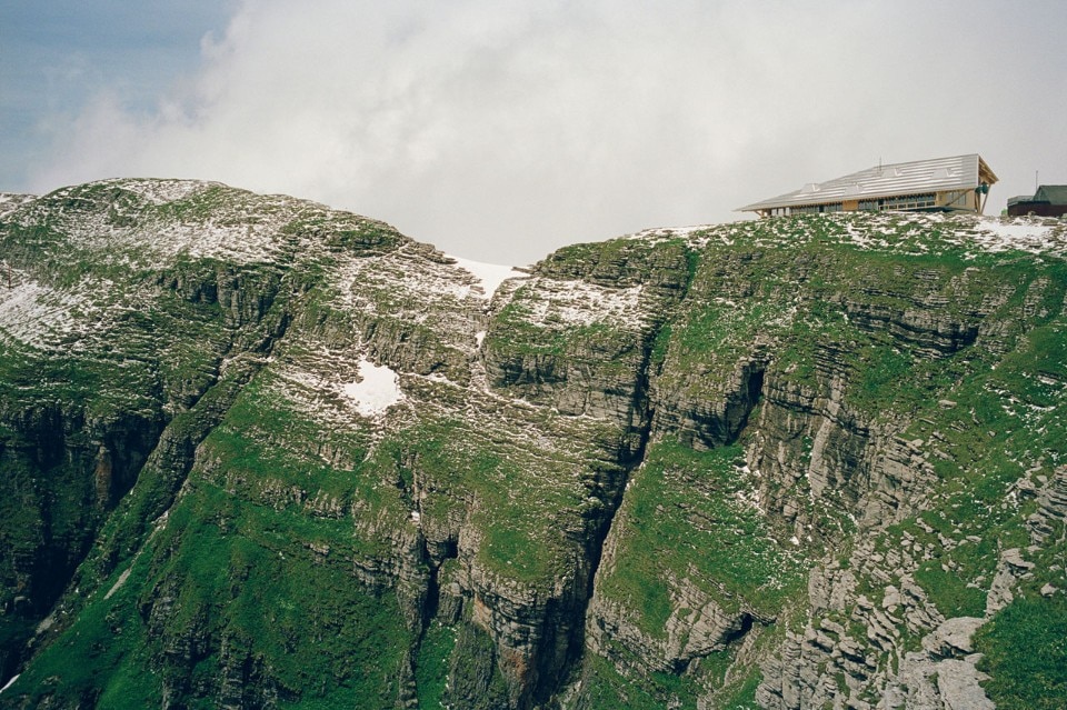 Ever since the cable car went into operation, the restaurant has been provisionally located in the housing originally built for the construction workers. Now it has been torn down to make room for a new restaurant. The station, a pragmatic steel structure on a concrete foundation typical of the 1970s, has remained and been clad in a different facade. The new mountain restaurant is placed perpendicular to the station, extending horizontally along the mountain panorama towards the south. A large roofed area connects the two structures and creates an outdoor arrival hall.