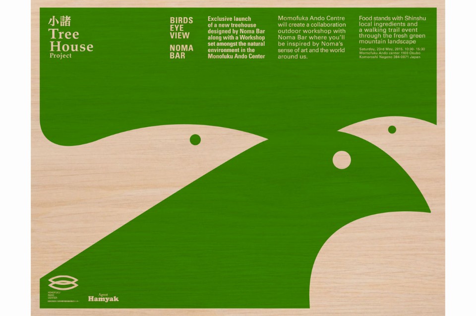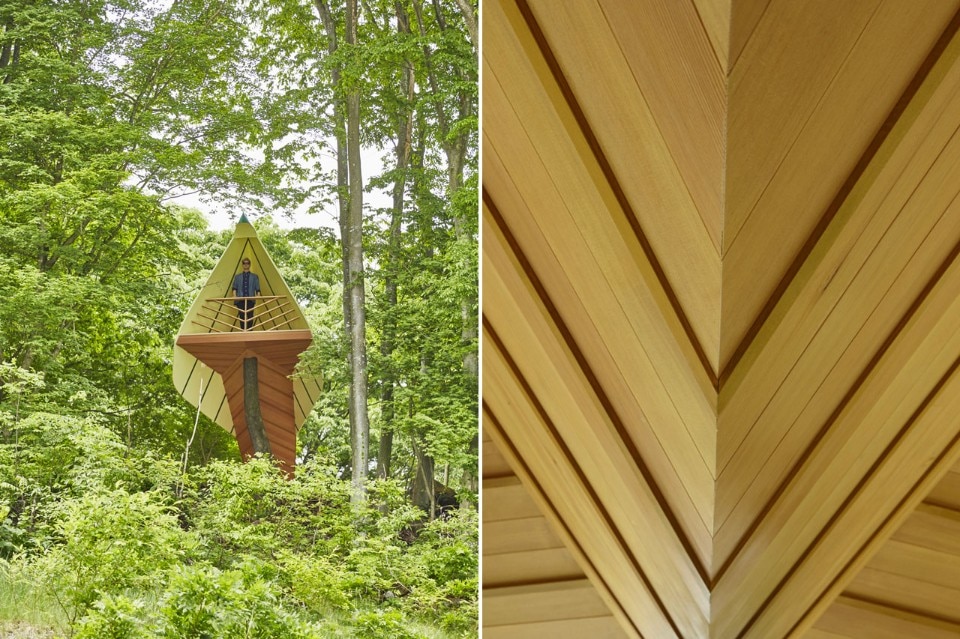Standing 9 metres in height the bird structure is discovered amongst the trees, harmoniously using a single tree trunk as support for the view house, reminding you of how Bar usually constructs illustration with simple geometric shapes, using an economy of form to allow the audience a sense of discovery and storytelling.