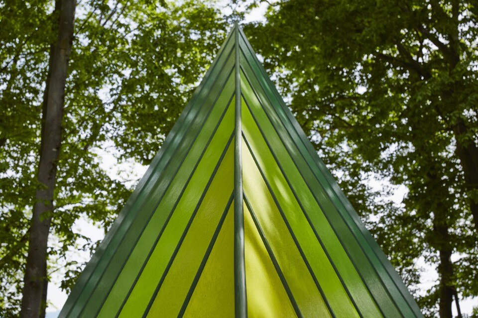 Birds Eye View is located in a high point amongst a wooden area; with visitors at first encountering giant leaf shapes made from wood whose profile form the shape of a bird. Bar’s source of inspiration for the work came from the chance finding of 2 leafs on the floor, their position reminding him of the shape of a bird in profile. A moment of visual chance, the work takes this concept into architecture, revealing the bird shape only from one point of view, adding depth to the visual playfulness, allowing the reveal only as the public explores the location.