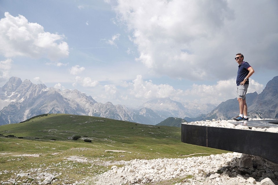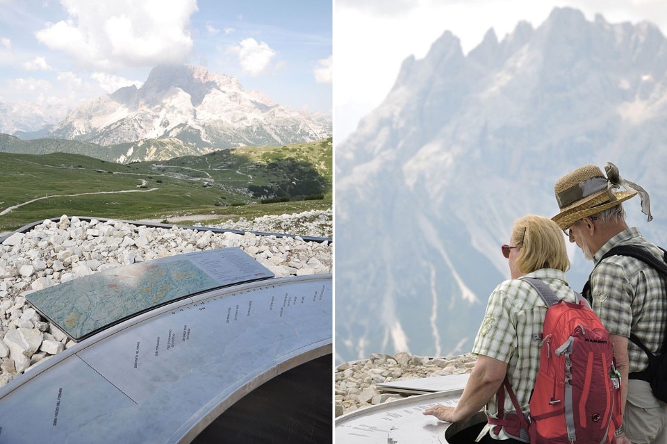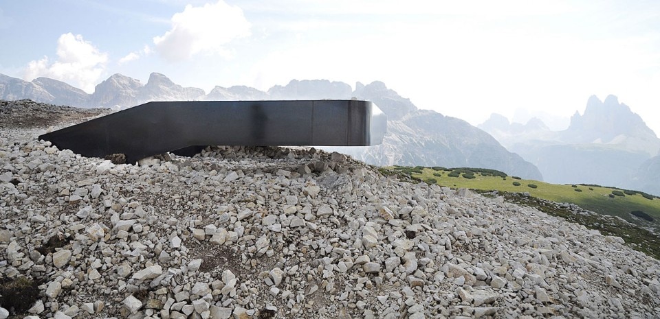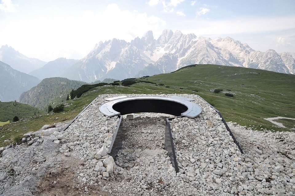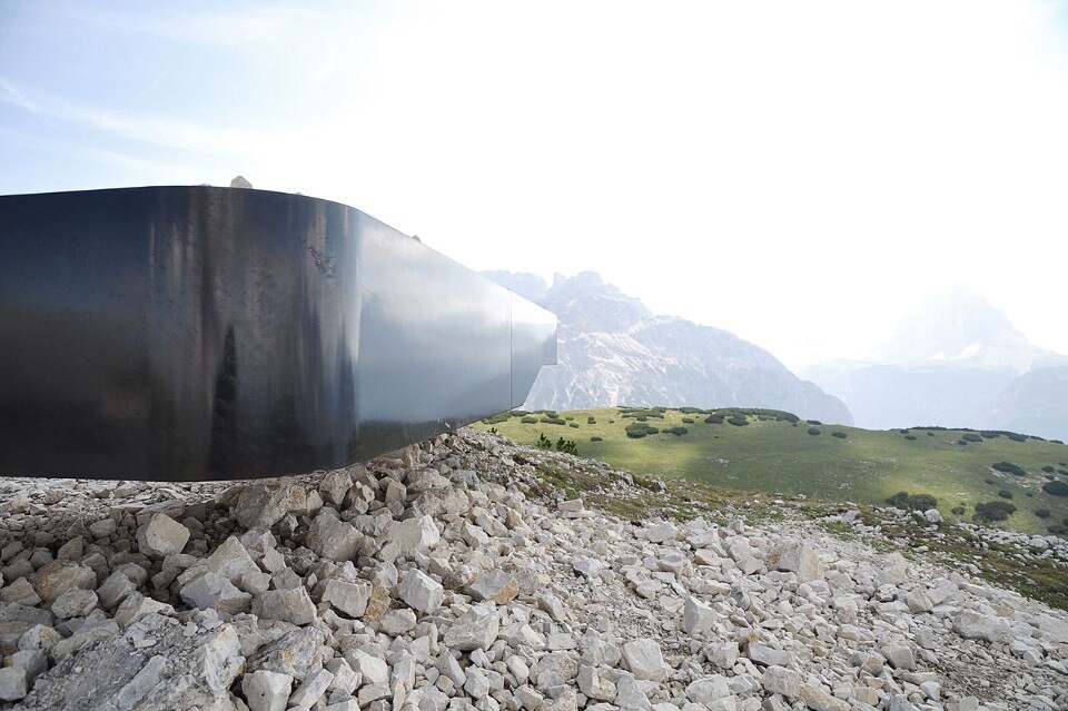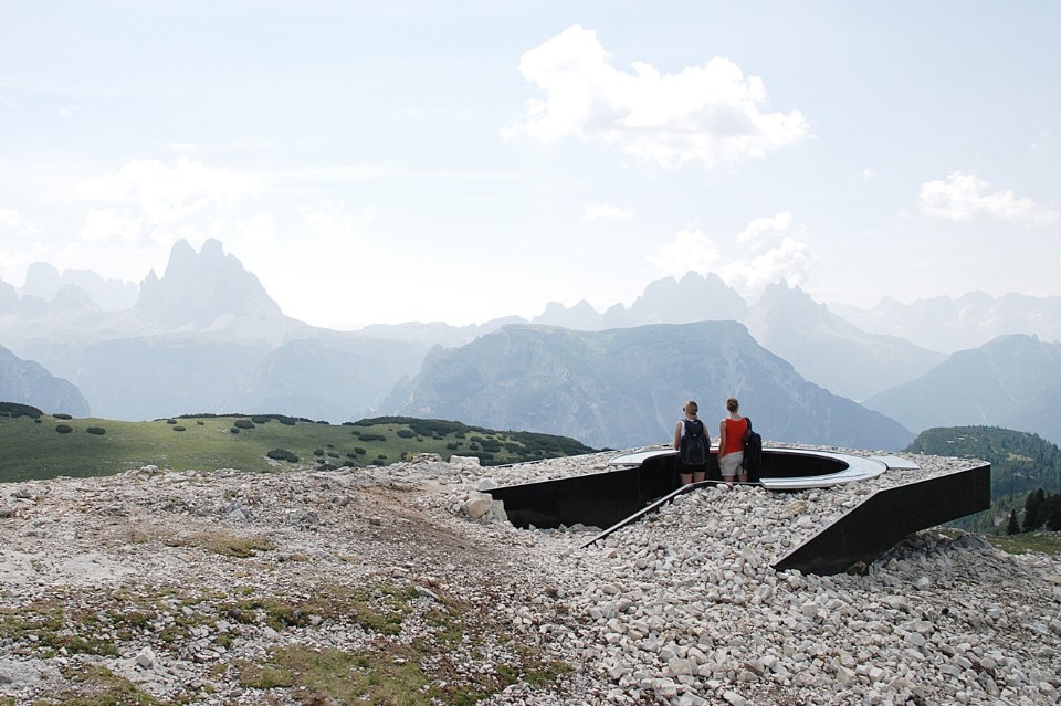 By “raising” the soil they obtain the top of the platform, which partly floats above the ground. The outer perimeter is made of steel, filled with rubble/material from the site. The constraints between building and context blur. A small canyon leeds to a circular opening in the center of the platform, where informations is stored. A circular index made of stainless steel shows the visible summits. Further information about the landscape and the geology of the Dolomites is found on the outer skirt of the index.