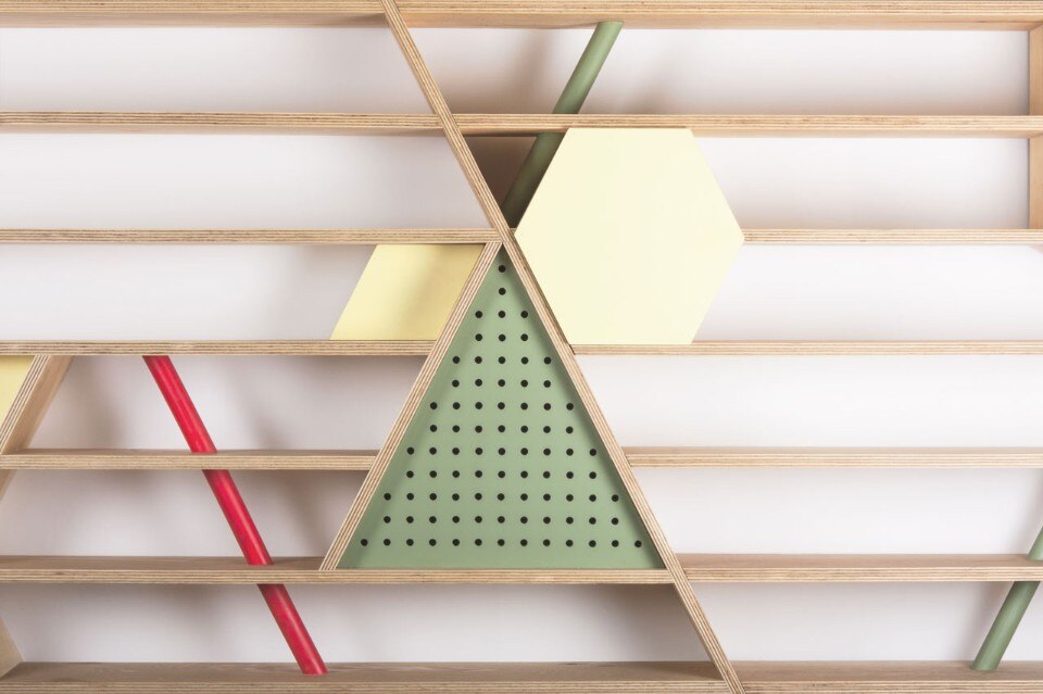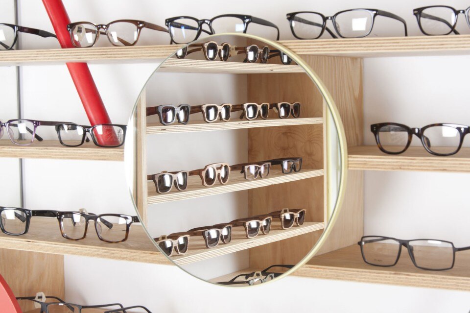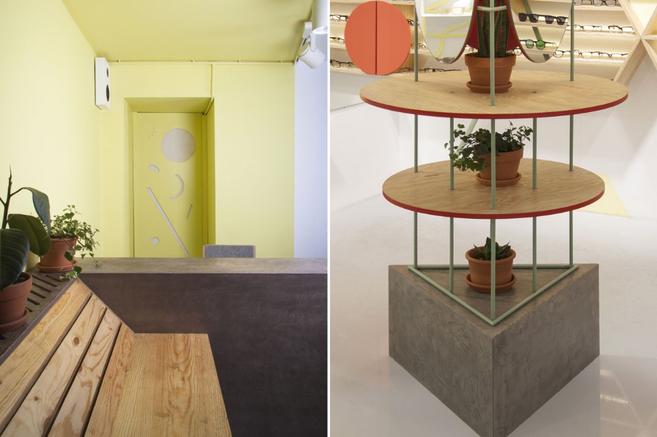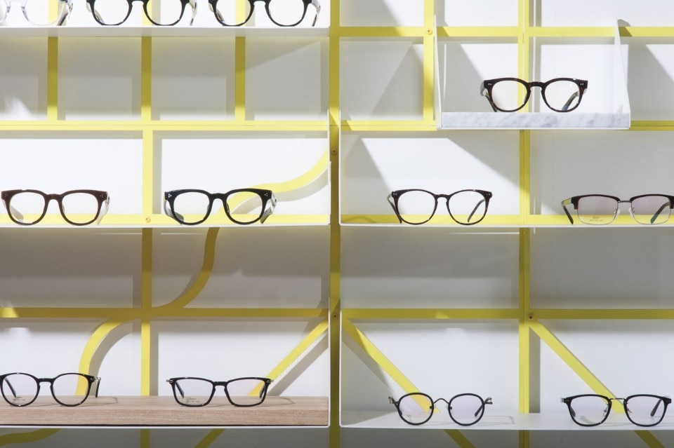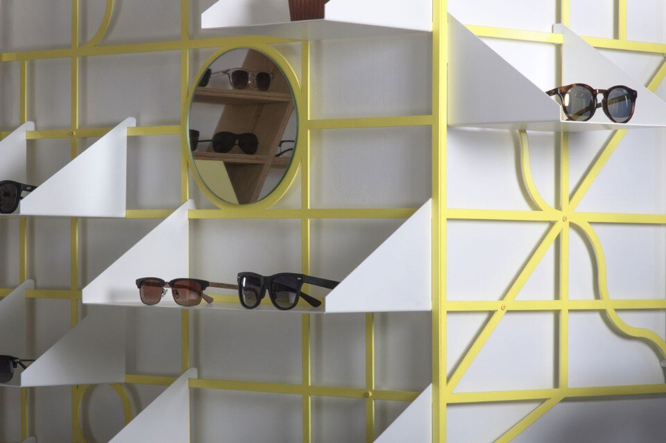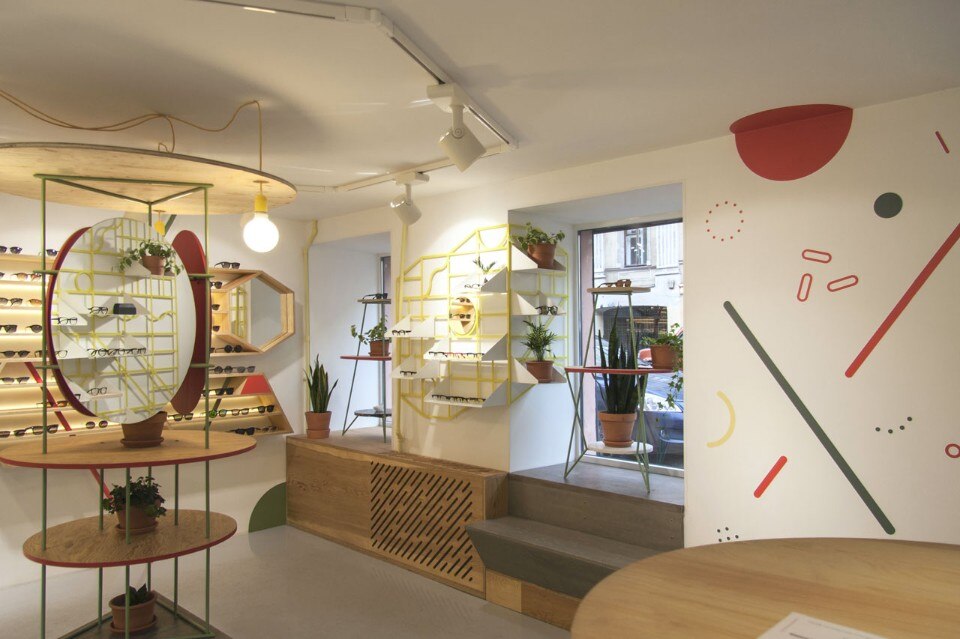 Lesha Galkin made a three-sided vertical construction for fitting glasses in the center of the interior, designed to allow three clients to try glasses at the same time without seeing each other.