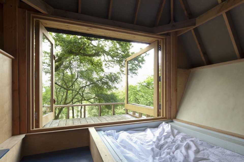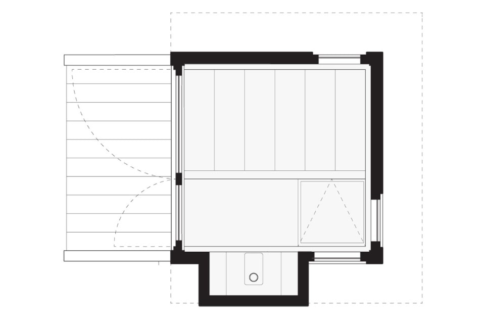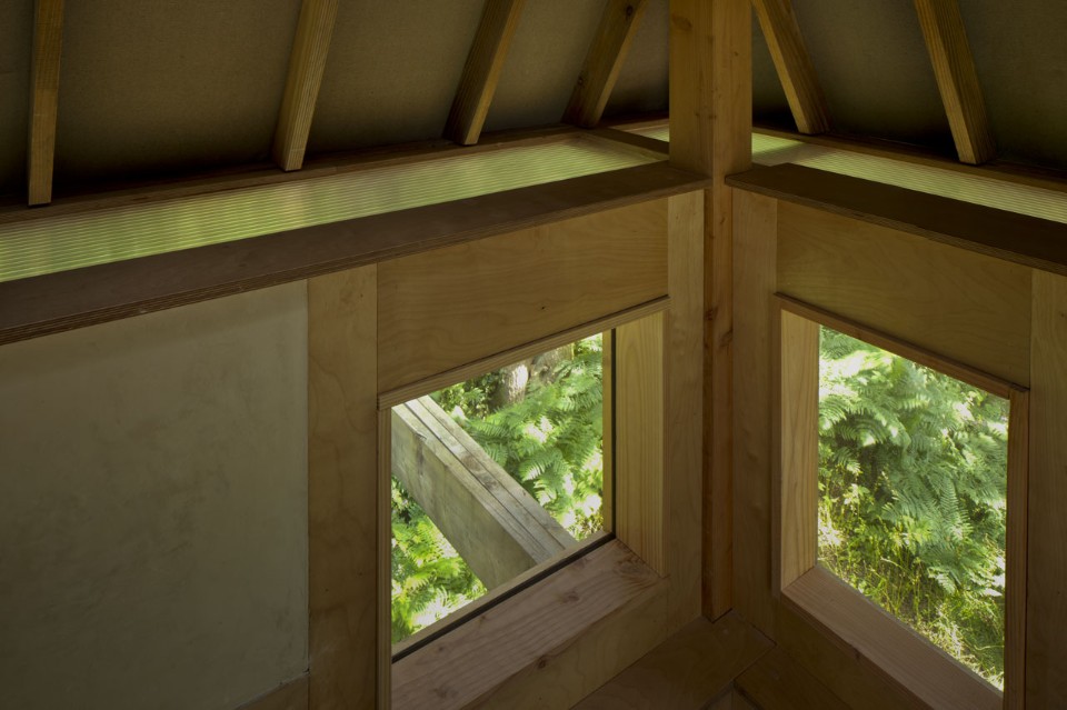 Maximizing a small 2.5m x 2.5m foot print, the floor is split into two levels, an entrance area with an alcove with woodburning stove and a raised main floor level which houses a bed under a removable plywood floor. The eave of the roof returns into the interior as a ledge of polycarbonate soffit and plywood table area.