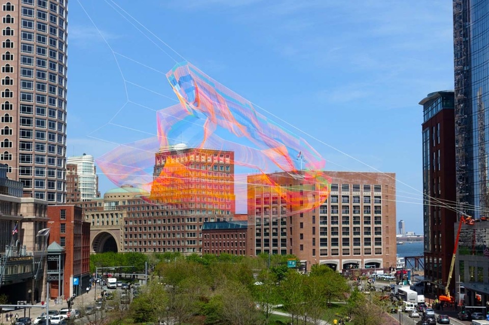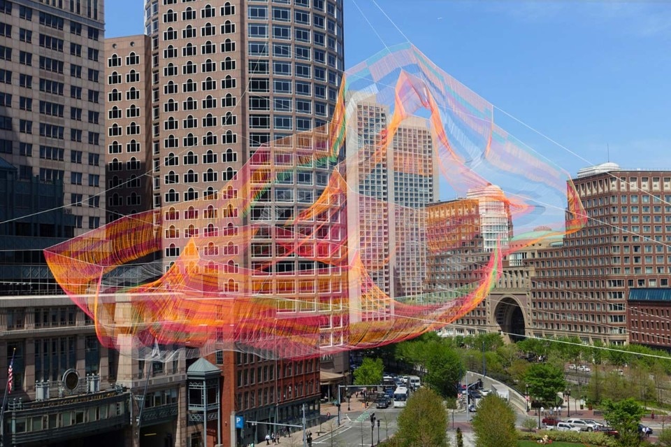 The work invites you to linger, whether seen amidst the skyline from afar, or lying down on the grassy knoll beneath. It embraces Boston as a city on foot, where past and present are interwoven, and takes our gaze skyward to feel the vibrant pulse of now. It invites you to pause, and contemplate a physical manifestation of interconnectedness – soft with hard, earth with sky, things we control with the forces beyond us.