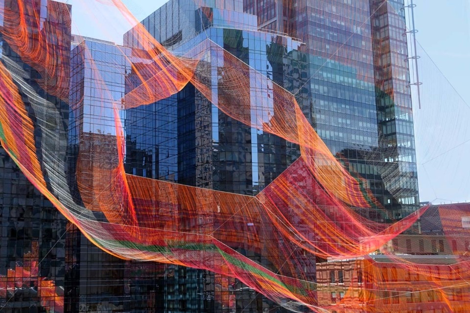 The sculpture is made by hand-splicing rope and knotting twine into an interconnected mesh of more than a half-million nodes. When any one of its elements moves, every other element is affected. Monumental in scale and strength yet delicate as lace, its fluidly responds to ever-changing wind and weather. Its fibers are 15 times stronger than steel yet incredibly lightweight, making the sculpture able to lace directly into three skyscrapers as a soft counterpoint to hard-edged architecture. It is a physical manifestation of interconnectedness and strength through resiliency.