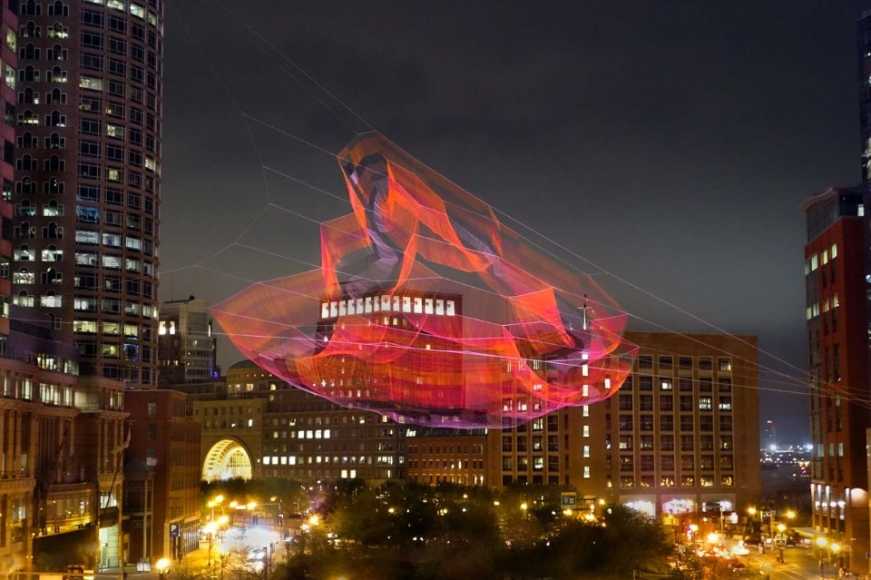 In daylight the porous form blends with sky when looking up, and casts shadow-drawings onto the ground below. At night it becomes an illuminated beacon. The artwork incorporates dynamic light elements which reflect the changing effects of wind. Sensors around the site register fiber movement and tension and this data directs the color of light projected onto the sculpture’s surface.