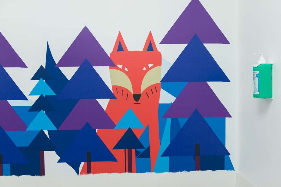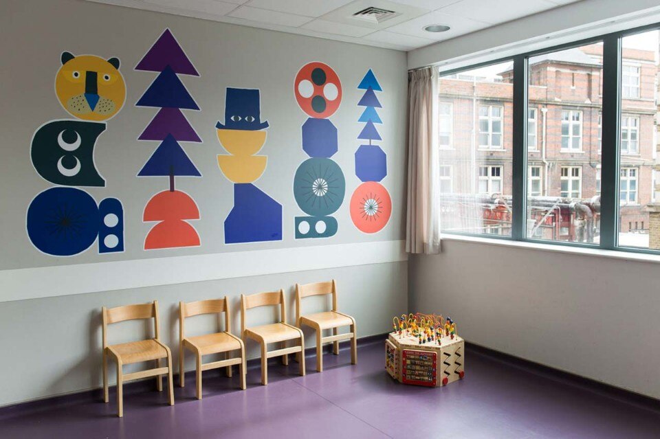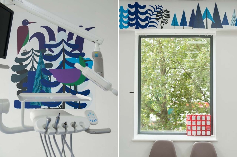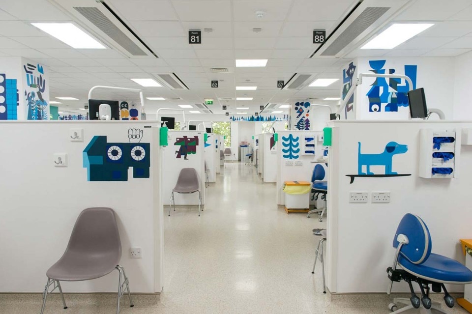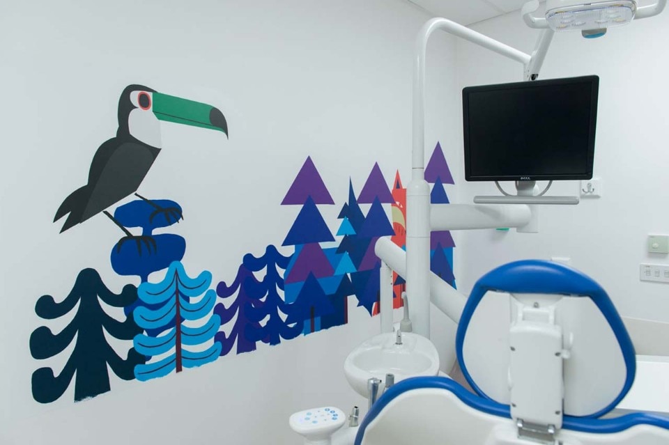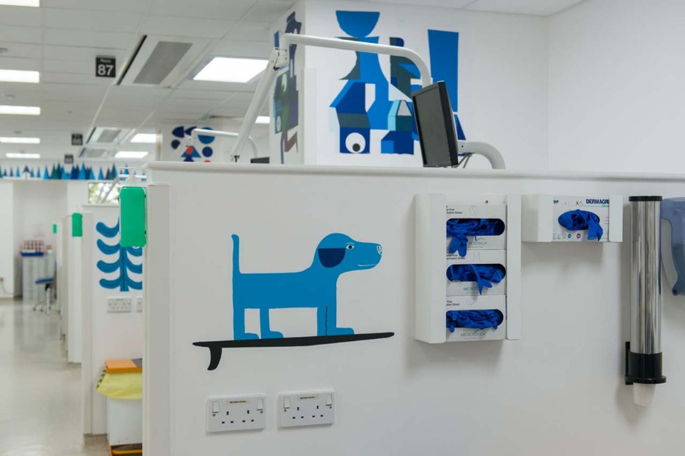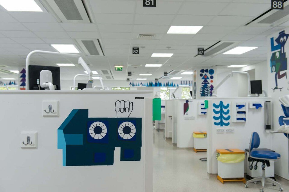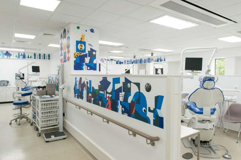 The artwork is positioned across the ward particularly in locations where the illustrations could be viewed whilst in the dental chair to help to relax the patient some of whom arrive for emergency procedures. Also this was installed to create a warm and stimulating environment for staff whilst on duty.