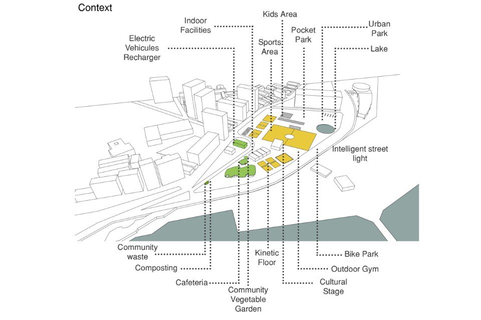 panels above the rooftop, vertical wind generators solar thermal panels for heating water and the kinetic energy generated from physical activities in the park.