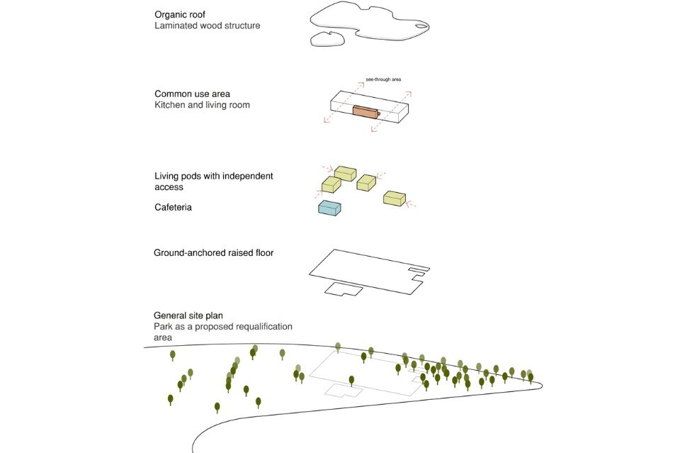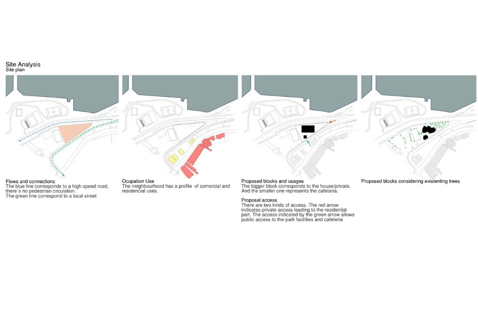 The idea of mutualism permeates all the project’s decisions, generating active relations between the house and its context. The space is attended by members of the community and sportsmen that use different courts. Kinetic energy generators will create electricity through physical activities, exemplifying the positive relation between the house and the park, where both produce energy instead of consuming it.