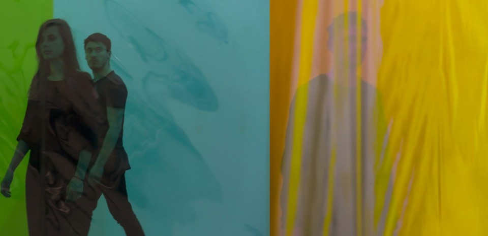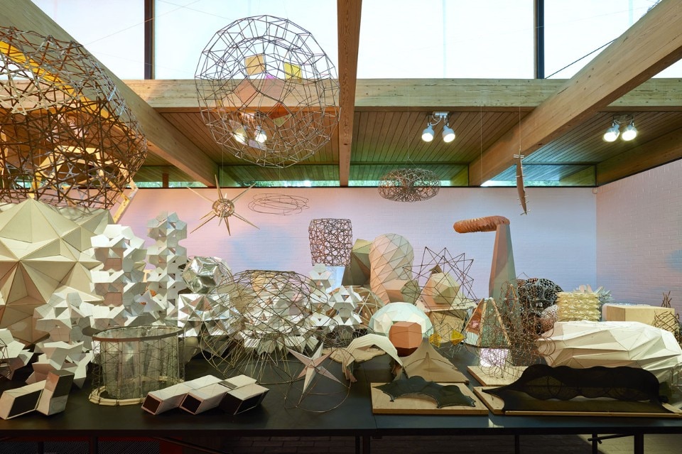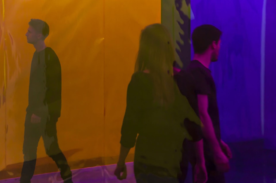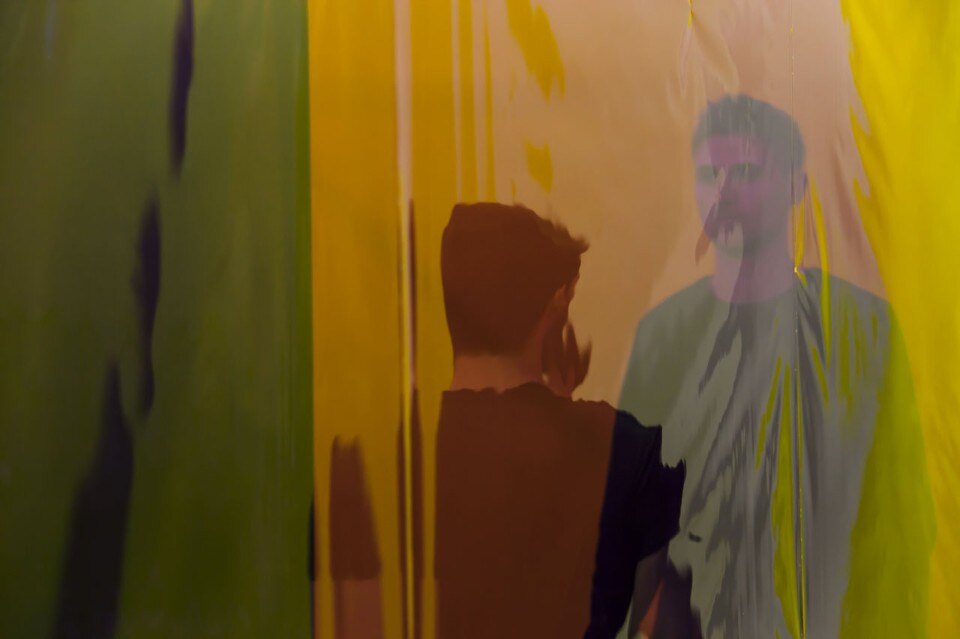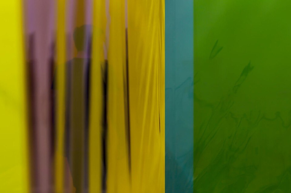 Movement in various forms characterises many of the exhibition’s installations. Sometimes movement is an inherent part of the work, as in Ventilator (1997), where a fan circulates in irregular ellipses above the visitors’ heads. In other works the components are static, and the viewer’s own movements take centre stage, as in Beauty (1993) where the perception of the work is entirely dependent on viewer’s position in the room. In some cases viewers move through the work, as in Seu corpo da obra (Your body of work) (2011). In this installation, monochromatic colour filters create semi-transparent walls that float in the room. A labyrinthine architecture of coloured space is created. Through the viewer’s movements in the room, the filter’s three colours – magenta, yellow, and cyan – can be seen overlapping in a variety of configurations as various hues emerge in the viewer’s vision.