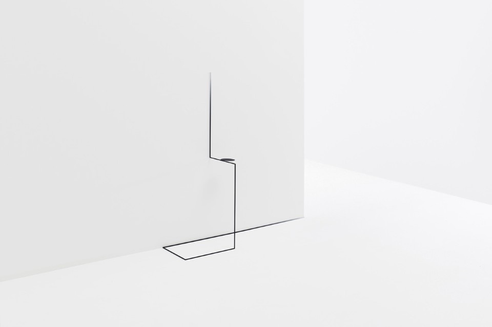 In the process, they took turns in verifying how the furniture was balanced as it was placed within the space, as well as the proportion of the furniture itself. This resulted in the creation of mysterious tables that consisted of a 5mm square metal rod with a small tabletop measuring a radius of 100 mm attached to it. The design utilizes the element of space as a part of its structure by “parasitizing” on to the corners or edges of the walls, the edge of the floor and exhibition stands.