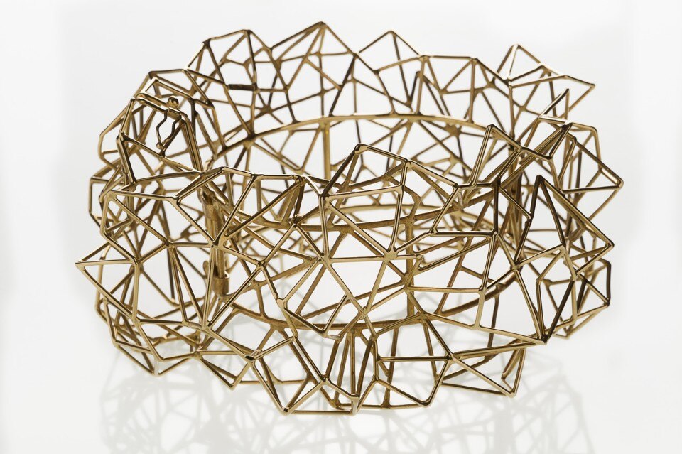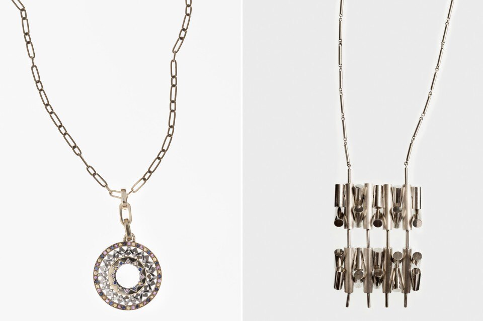 Left: Anna Gili, Pendente Mandala, Manifattura Nicolas Cola, white and yellow gold with diamonds, 2001. Right: Arnaldo Pomodoro, silver, 1967