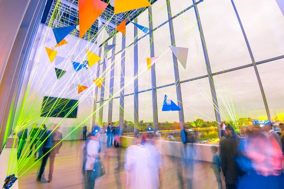 In his Digital Jungle, young Belgian artist Tom Dekyvere – known as Them Sculptures – incorporates 2 km of fluorescent cord, onto which light is projected. In this way he visually expresses the contrast between the natural and the artificial, technological world. “In the production analogue and digital, humans and robots, go hand in hand. The connection with the new building is also important, because the projecting glass volume in which the work is installed suggests a sort of museum/greenhouse, created to ‘cultivate’ the work.”