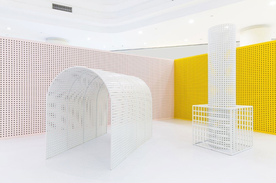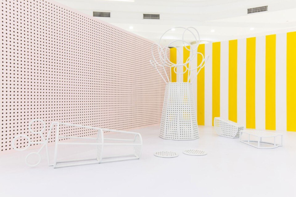 The bent white cylindrical frame of each structure encapsulates perforated mesh. Together they create a bountiful food landscape composed of oversized mushrooms, a carrot, a tree-like broccoli, a fried egg, a half-peeled banana, a chunky shrimp… and the shopping list continues.