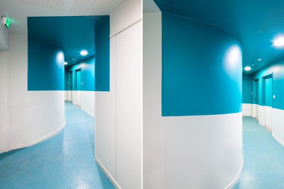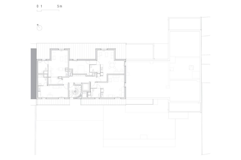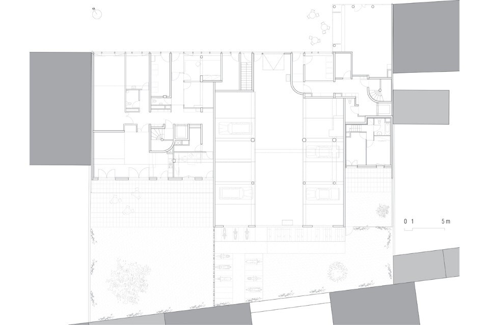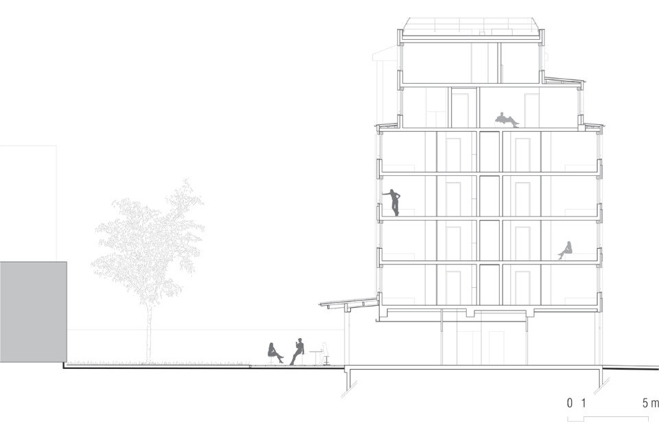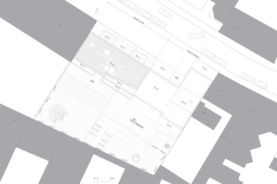 Two distinct T-shaped volumes correspond to the two different aspects of the development: the social accommodation in the building parallel to the street and the family homes built on the perpendicular site. The two volumes create a dialogue by the break and the continuity of the materials used on the top floors and the main body of the building making it possible to keep the back section of the lot for gardens.