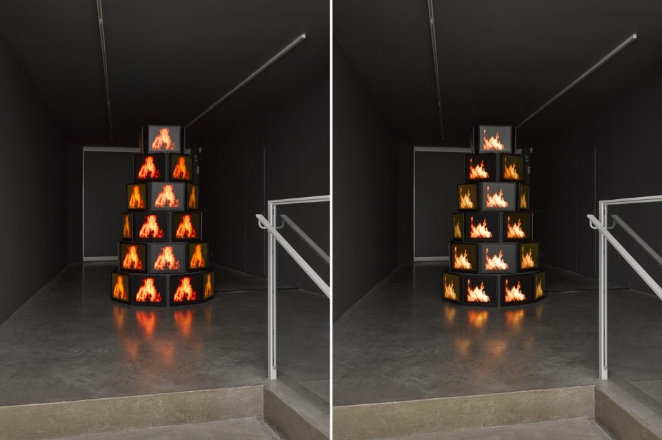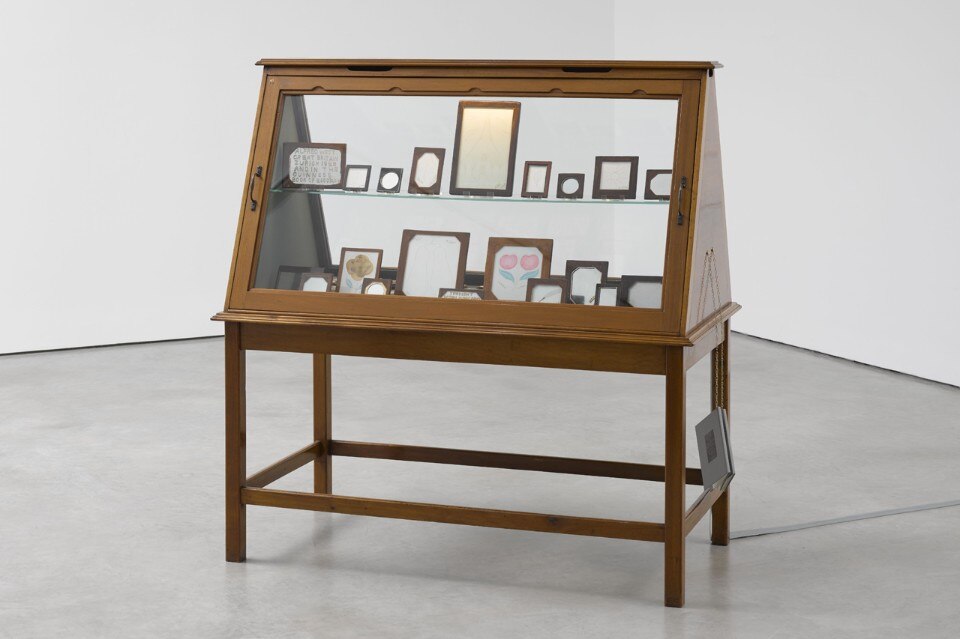Hiller’s investigation into belief and the unconscious is continued in works that celebrate other artists. Emergency Case: Homage to Joseph Beuys (1969–2011) presents first-aid cabinets containing miniature phials filled with water taken from holy wells and streams, referencing both Beuys’s ability to endow ordinary materials with sacred values and persistent popular myths. Homage to Marcel Duchamp: Auras Triptych (2011) takes shape as an altar illuminated by photographic ‘aura’ portraits of three ordinary people, replacing the traditional icons of saints with halos. In Homage to Gertrude Stein (2011), Hiller stuffs an Art Deco writing desk with books on automatic writing and related subjects, displaying the celebrated author’s rejected interest in automatism and related subjects.