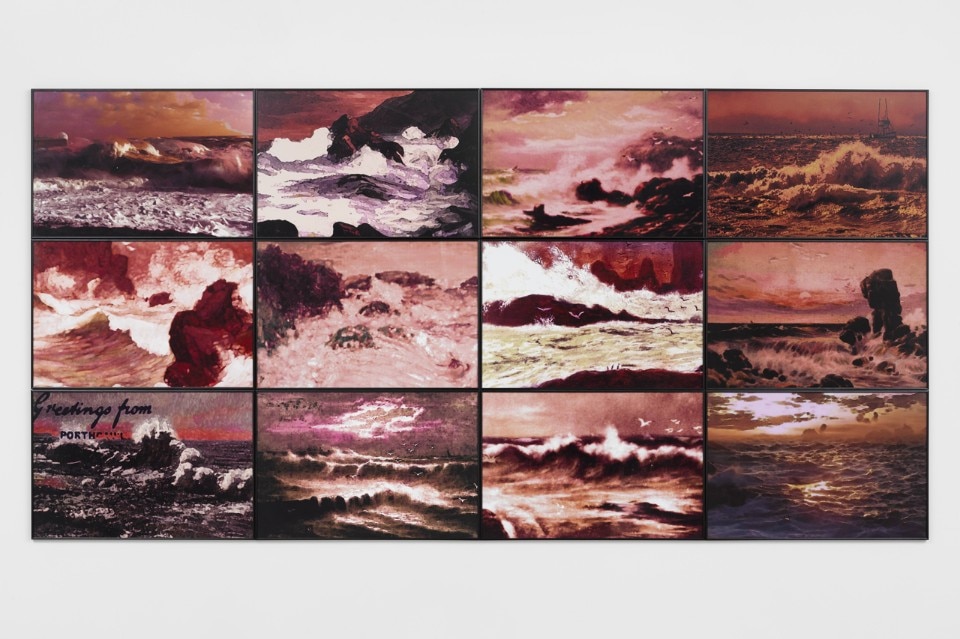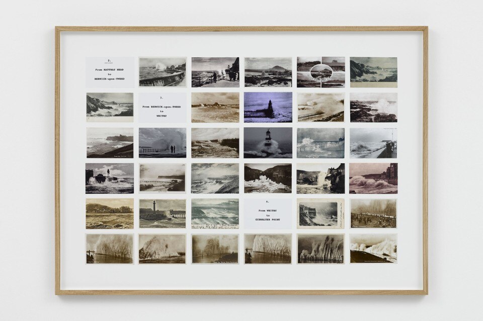 The transformation of materials, auratic visions and the homages to works by others come together in Hiller’s most recent multi-panelled work On the Edge (2015). Taking as its starting point her seminal work Dedicated to the Unknown Artists (1972-1976), On the Edge presents 482 views of 219 locations on the edges of Britain, where the rough sea meets the land, as represented by anonymous photographers and artists in postcards collected and appreciated by Hiller over many years. These images are tiny echoes of the grand tradition of the sublime, collected on holidays; they are cracks in the polite surface of everyday life, hints of desires for wildness and fantasy, aspects which Hiller emphasizes in her large re-imaginings of these postcard images in works such as Towards an Autobiography of Night (1983) and Rough Dawns II (2015).