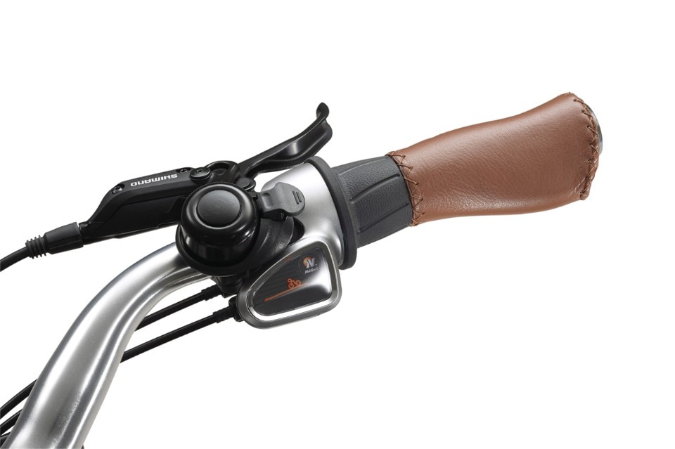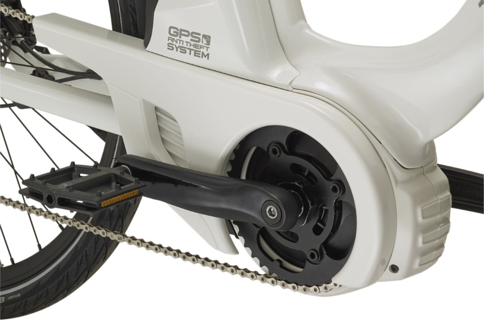 The frame is made entirely in aluminium with a clearly sport look and mounts a shock absorbed fork, also made in aluminium. The powertrain parts (electric motor, transmission and battery) seamlessly insert into the frame, leaving the bicycle’s lines rationally clean and undisturbed. In fact, the motor, designed around the pedal axle, remains hidden by the sprocket, whereas the battery, housed under the saddle on the horizontal pipe, can be easily removed.
