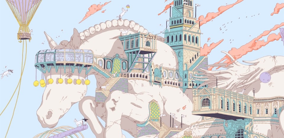 With the giant monument dedicated to the horse printed on his first Hermès scarf, young illustrator Ugo Gattoni brings us into his phantasmagoric, surreal and ironic world.