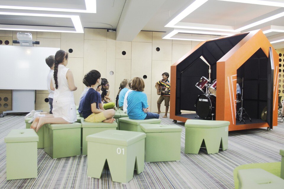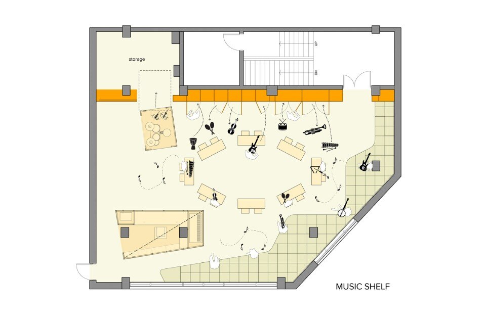 The first design feature is a smart, efficient, and creative storage system to house all the musical instruments and other elements that are currently distributed along the room with no apparent order. The second feature is composed of two small rooms built inside the large room; the band rehearsal’s room and the office for the music teacher. The band’s room is mobile so that it can be positioned any place around the room.
