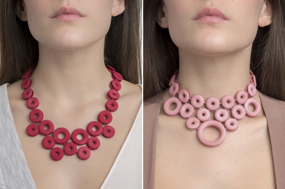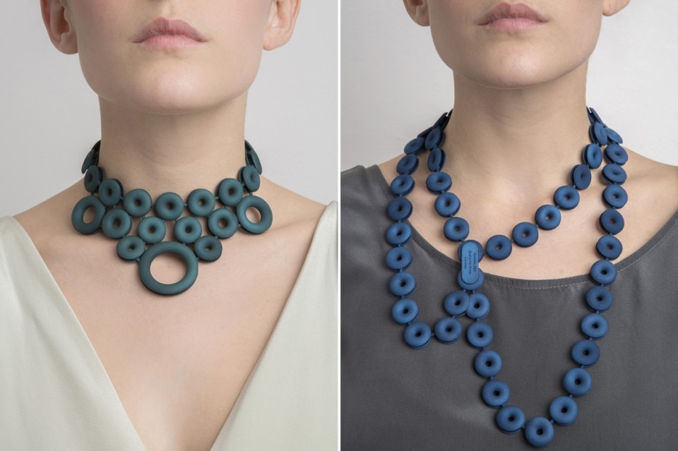 The collection, made of sintered nylon, comprises two necklaces, a long necklace, two earrigs and a ring, and is available in powder pink, powder blue, sage green, jungle green, night blue and black. Each necklace has a hook to regulate the length: it fastens to the holes of two adjacent rings and, in the case of the necklace it becomes and additional mobile element, capable of changing the shape based on the point where it is hooked.