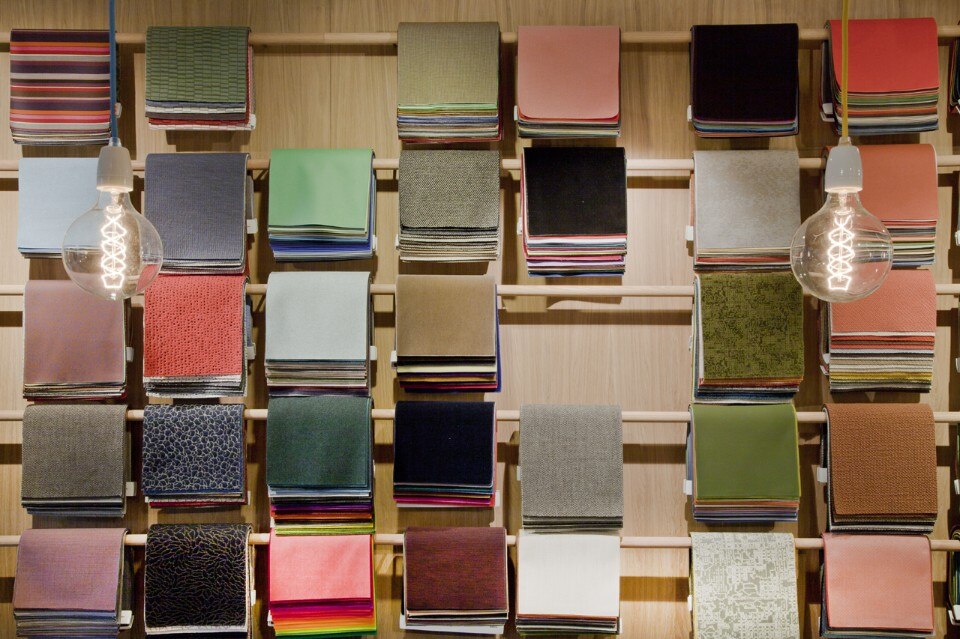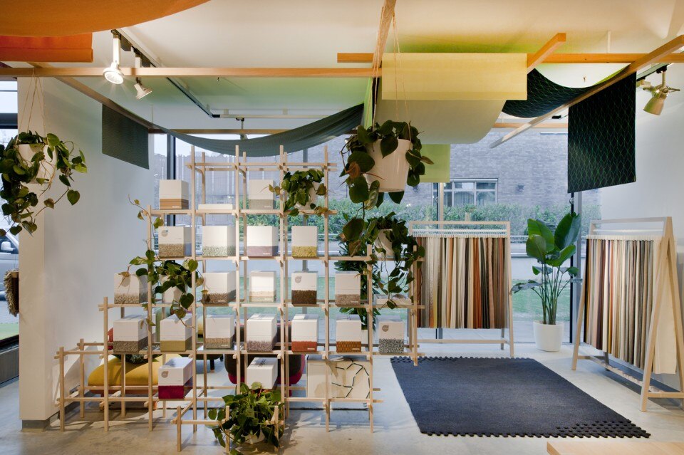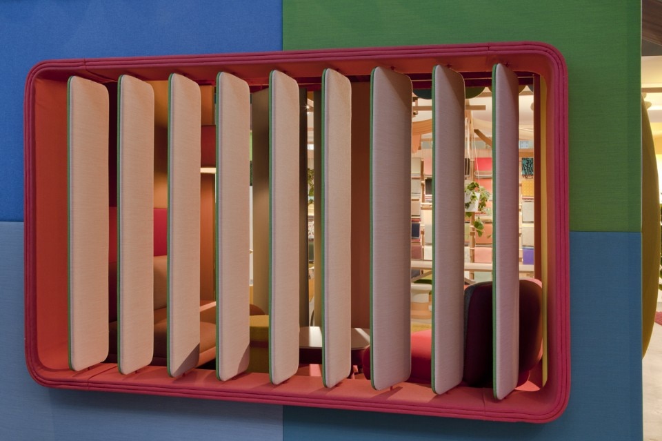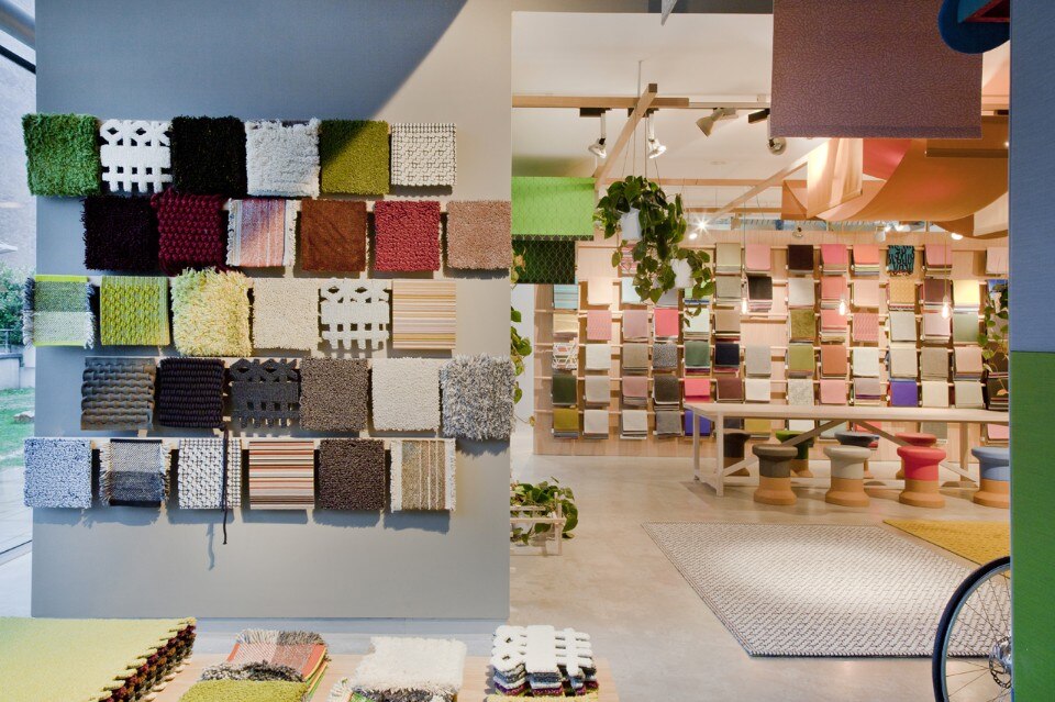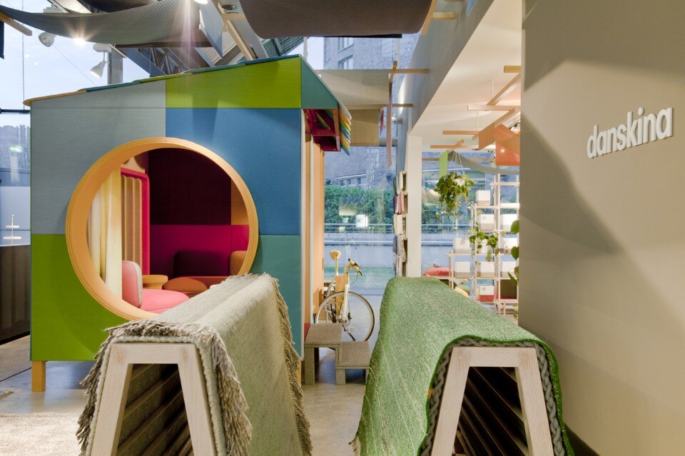 Aisslinger says: “To experience a complete Kvadrat colour collage in an exhibition space, we came up with the ‘Kvadrat cabin house’ – a small piece of architecture dressed as a collage in a wide range of fabrics. Here, all storage elements are conceptualised in a very new spirit: the curtain rack, the rug rack and the shelf are fresh ways of presenting Kvadrat’s textiles in a Garden of Wonders created from the material.”