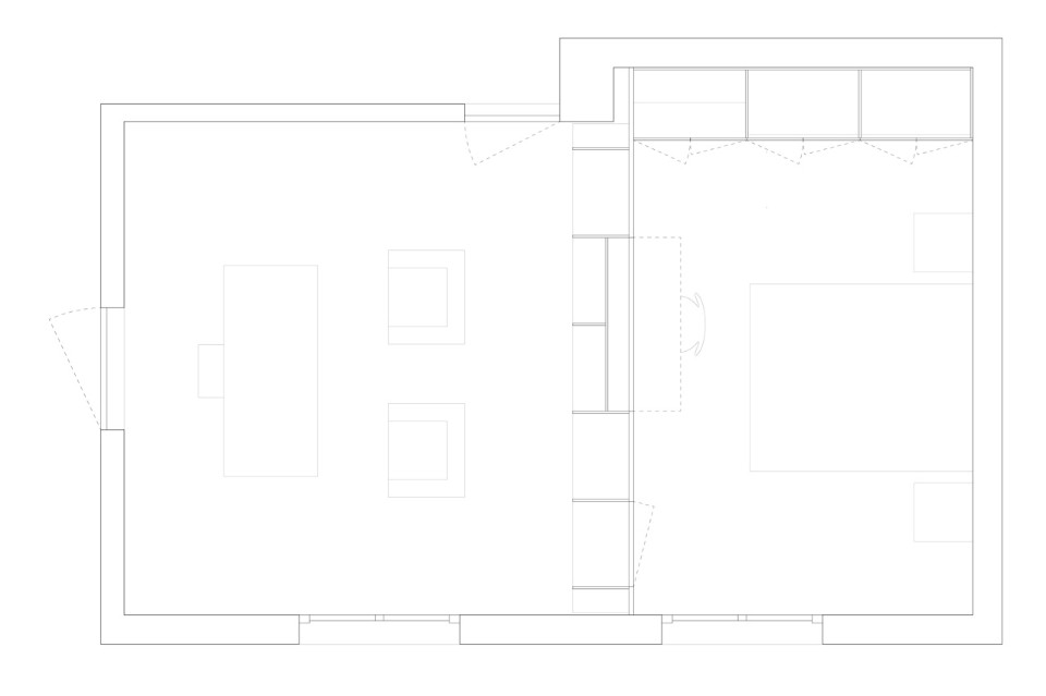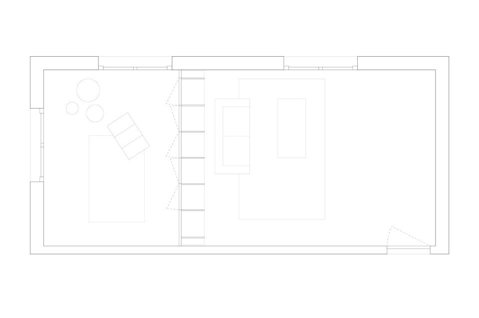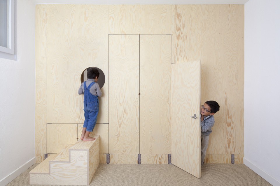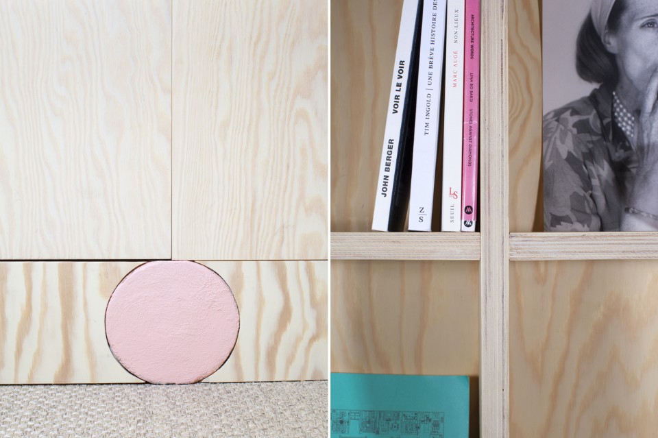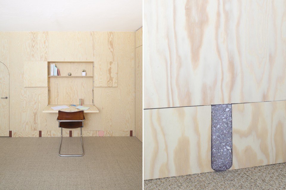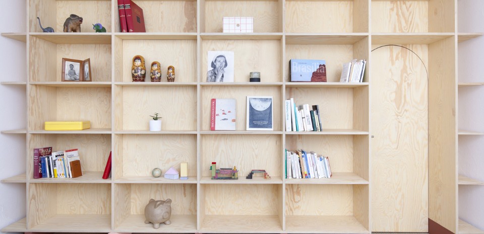 The second room contents a large bookshelf for the office with a door that provides access to the bedroom. The au pair’s room has then a whole wall dedicated to a built-in closet with pine doors and a pastel interior finishing. Another wall opens to provide her with a foldaway desk. The bookshelves are made of oiled pine plywood structures that sit on various masonry feet, which come from recycled bricks and landscape edging elements.
