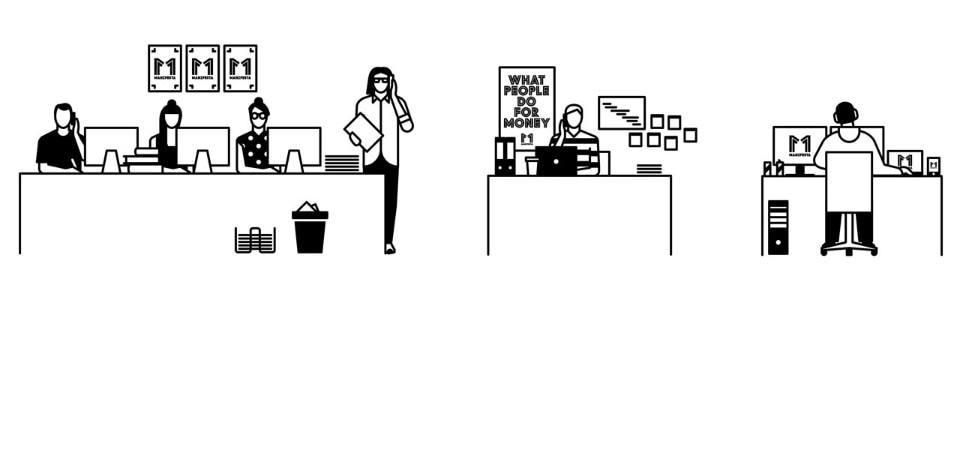 The Formal Emphasis. In addition to an expressive and bold, specifically developed typography, the formal emphasis is mainly on the application of pictograms that integrate societal, political and social aspects related to the topic of ‘working’. The pictograms consciously relate to the artistic and sociological foundations of the ‘Isotype’ conceived by Otto Neurath and Gerd Arntz in the 1930s. Clear Reduction to Black & White. Graphically, the system refrains from using colour and grabs the viewer’s attention through a deliberate reduction to black and white, which continues with clear, accessible language for floor plans and online navigation. Colour is not used until after the campaign has begun, with an application of photography that extends the system to a pictorial level and offers an atmospheric insight into Zurich’s working world – especially that of the joint venture partners, referred to as guests.