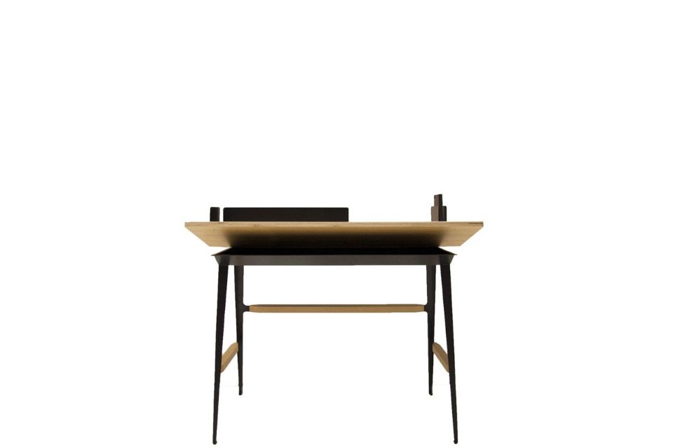 The collection – part of a larger project that will be developed in time – comprisers a small, lightweight desk with a flap top that can hold a laptop, sheets of paper and wires; pen holders and storage boxes in wood and metal are for personalising the space with different shapes and colours; an adjustable stool goes everywhere with the desk or can be moved independently for dynamic, improvised seating; a shelf made of wood and metal fitted with sliding elements is ideal for furnishing tables and desks to create a defined personal space anywhere.