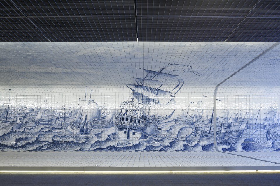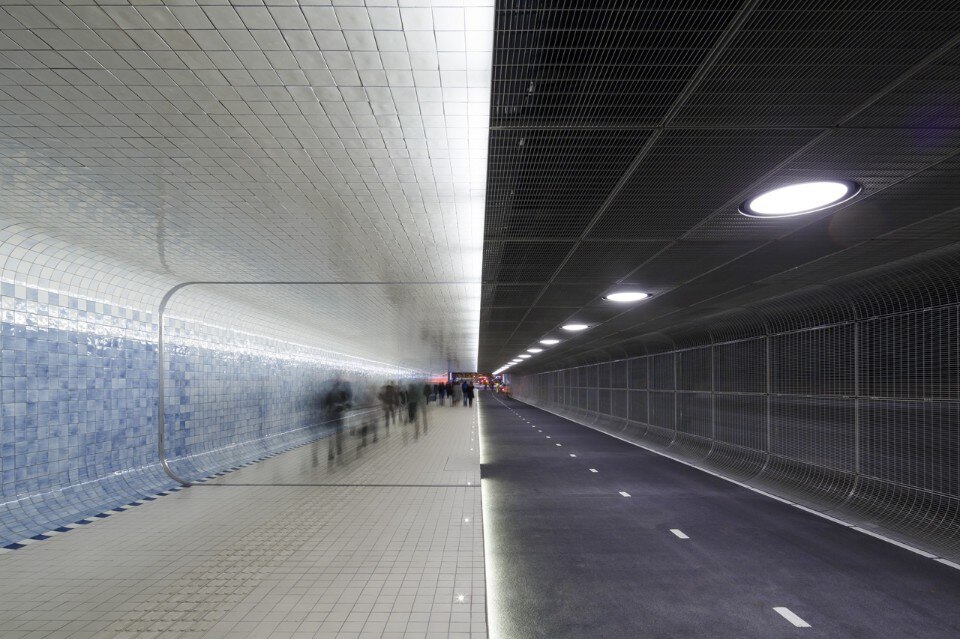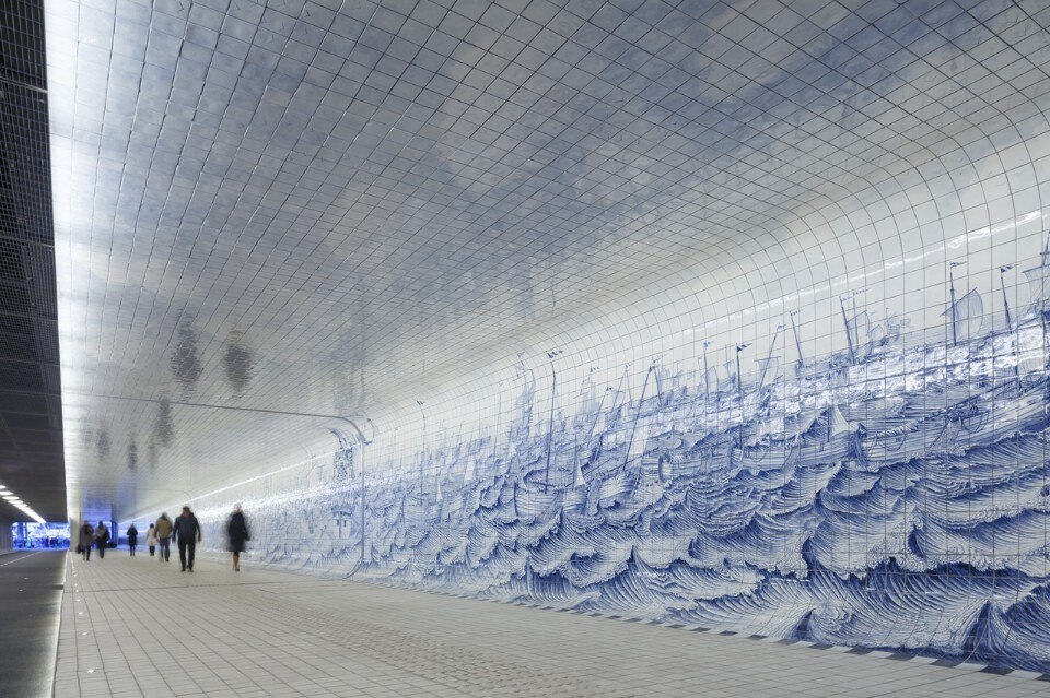 The tableau fades away towards the IJ-river, the lines of the original work gradually dissolving. Then it builds up again in an abstract form from light to dark blue, as if encouraging cyclists to slow down as the ferry comes into view. Its drawn lines and pixels also visualize the transition in art from the old to the new. The ceramic company, Royal Tichelaar Makkum, spent five years making the 46,000 wall tiles for the tableau, as well as 33,000 floor tiles, in the traditional Dutch tile size of 13 x 13 cm. In it, we see large and small merchant vessels, herring busses with nets in place, churning waves, gulls. The whole recalls old kitchens in Amsterdam canal houses, so that the tunnel is experienced as a safe place – as an urban room.